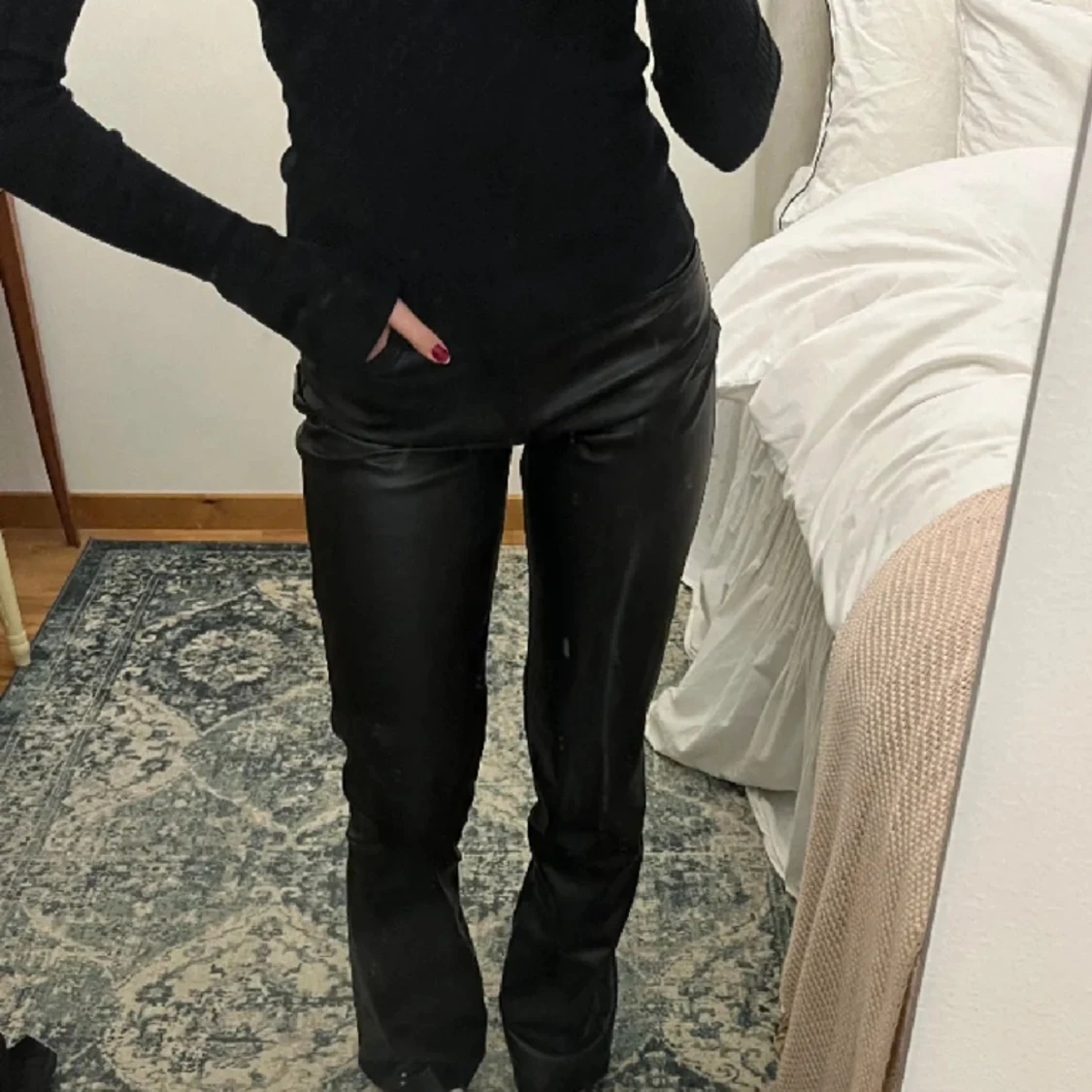 Säljer ett par skit snygga skinnbyxor från zara då de är för små för mig! De är använda typ tre gånger och sedan dess har de legat i min byrålåda tyvärr!