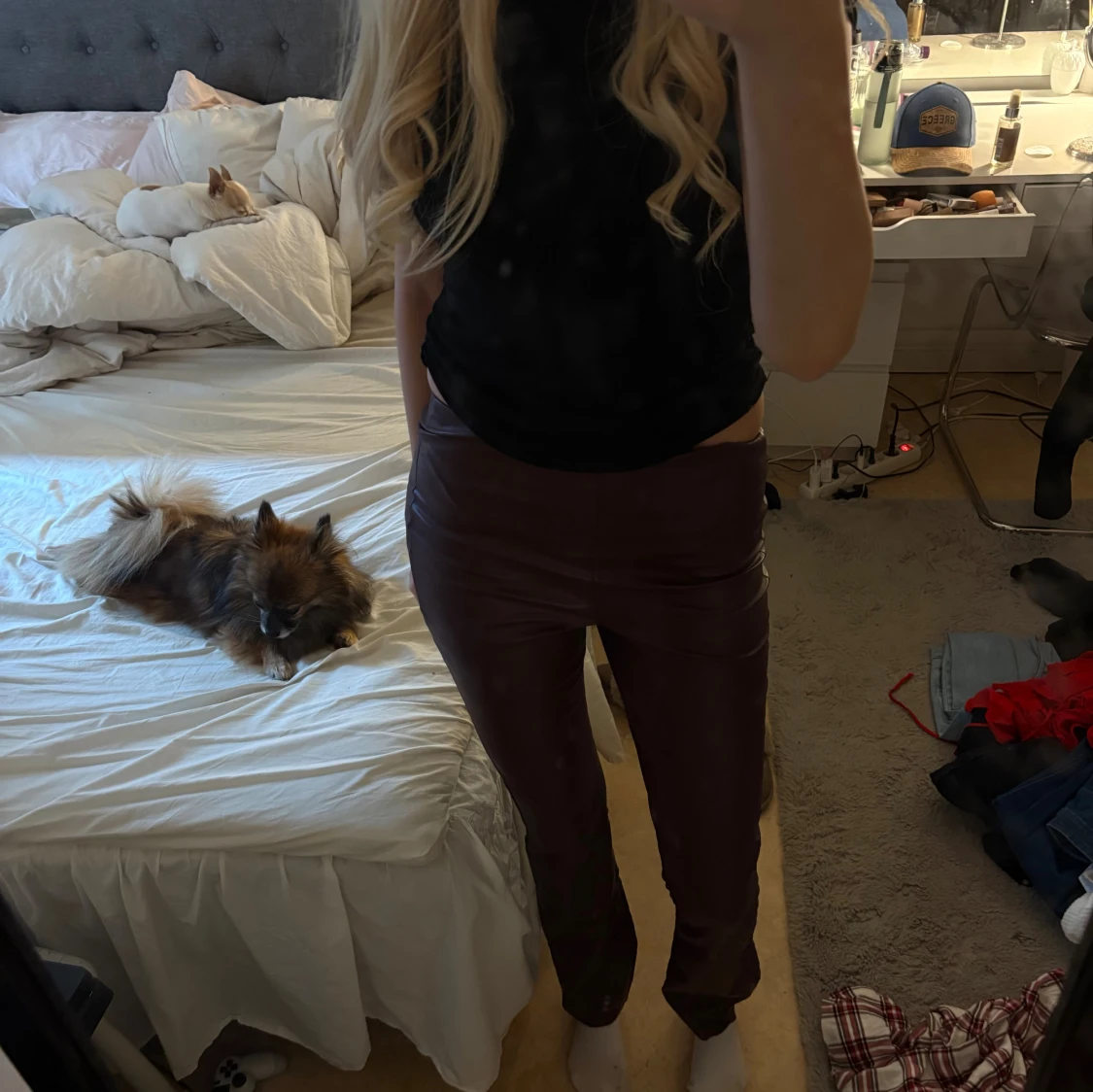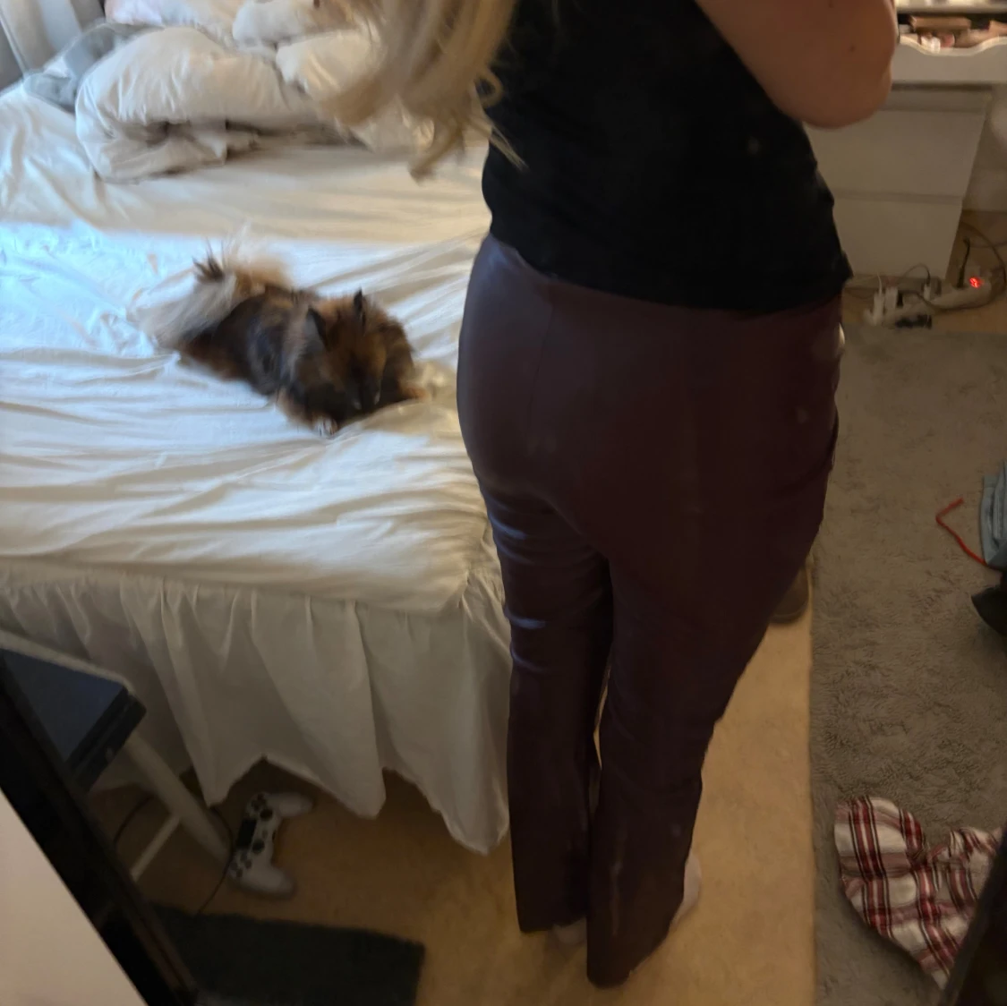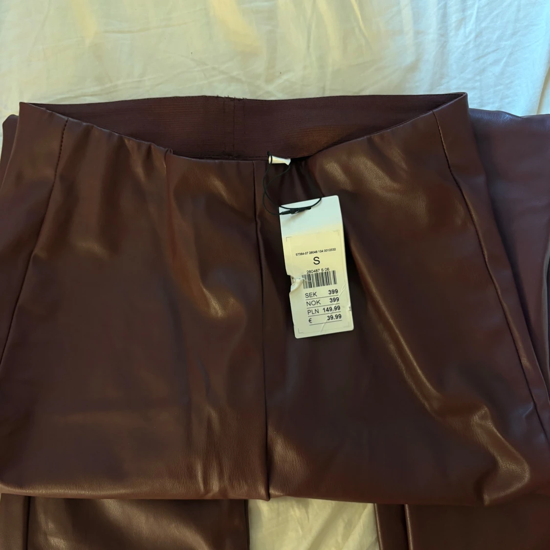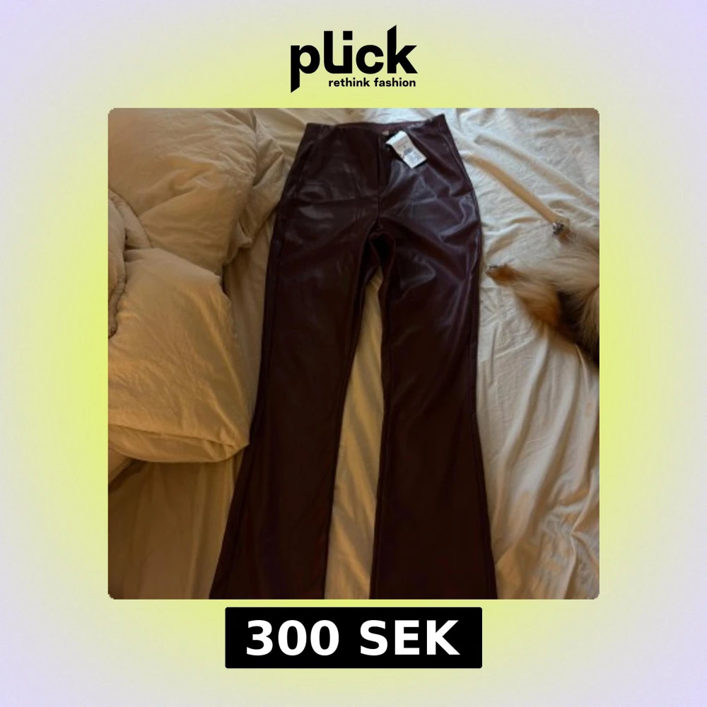Snygga vinröda byxor från kappahl i skinnimitation med bootcut passform och hög midja. Materialet är syntet och ger en cool glansig finish. Byxorna har ett stilrent och minimalistiskt uttryck utan synliga detaljer som fickor eller knappar. Perfekt för dig som gillar trendiga och edgy plagg.