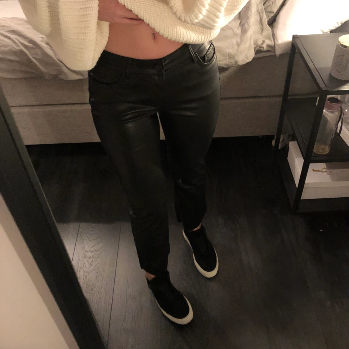 Säljer dessa skitsnygga mid/lågmidjade byxor i skinnimitation. Det är veromodas flared ankel modell. Tycker att de är något för korta på mig som är 167cm. 170kr och köparen står för ev frakt!💕