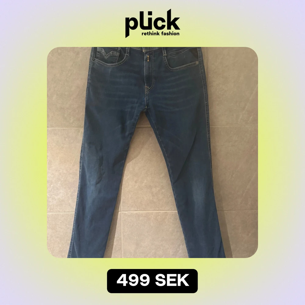 Säljer ett par snygga blå jeans från Replay i storlek 28/30. De har en klassisk femficksdesign och skinny passform. Perfekta för både vardag och fest! 🕺