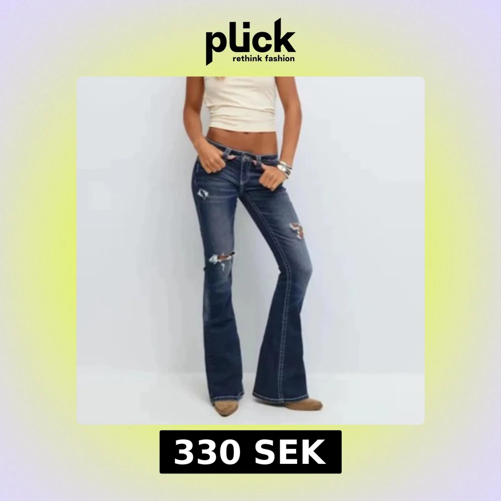 Snygga mörkblå bootcut jeans med slitningar på knäna och coola kontrastsömmar. Låg midja och broderade bakfickor ger en extra detalj. Perfekta för dig som gillar en avslappnad och trendig look. Använda typ tre gånger❤️