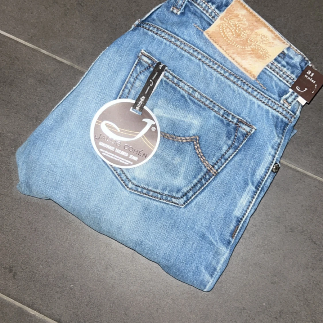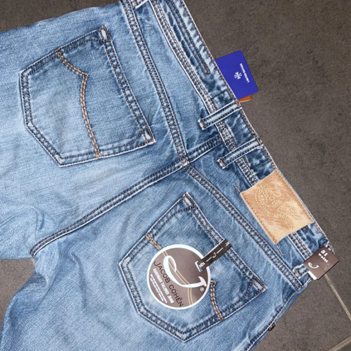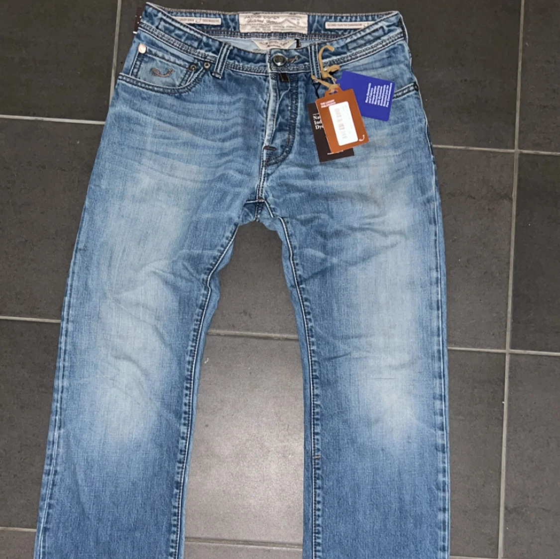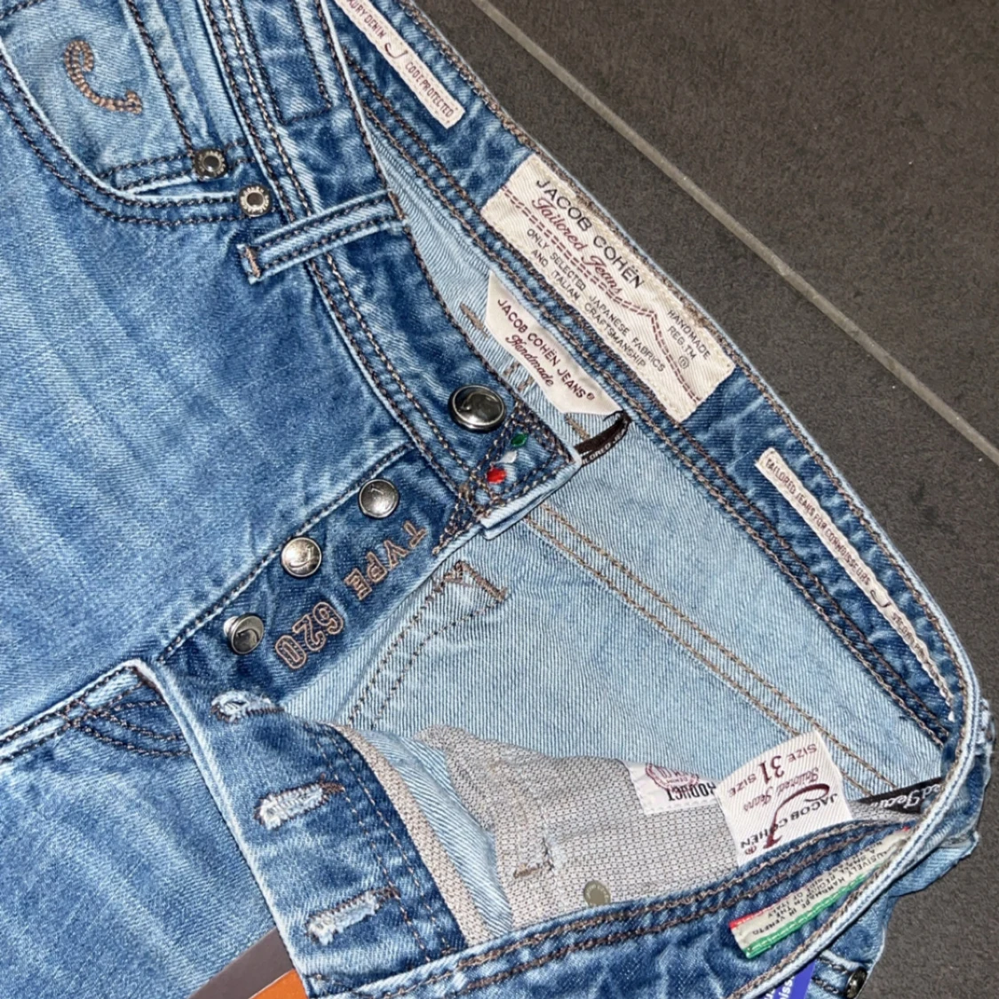 Snygga ljusblå jeans från Jacob Cohën, modell Type 620. Jeansen har klassisk femficksdesign, kontrastsömmar och knappar framtill. Materialet är mjukt jeans i bomull med en tvättad look och diskreta slitningar. Perfekta för dig som gillar stilrena och bekväma jeans. Skick 9/10!