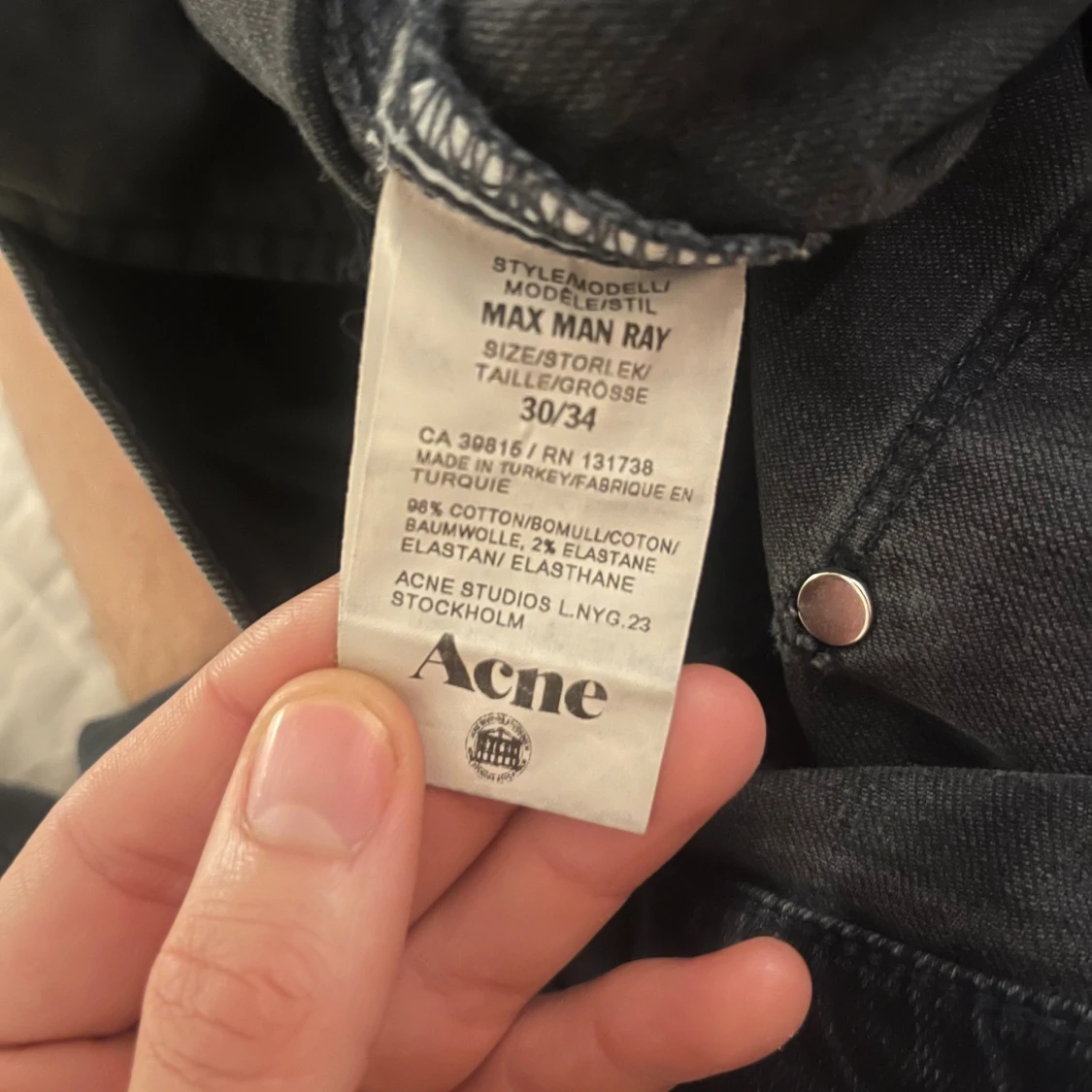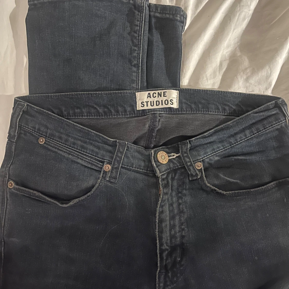 Snygga mörkgrå jeans från Acne Studios. De sitter slim fit o modellen heter ”Max Man Ray”. Enda defekten är slitaget där bak! Storlek 30/34.