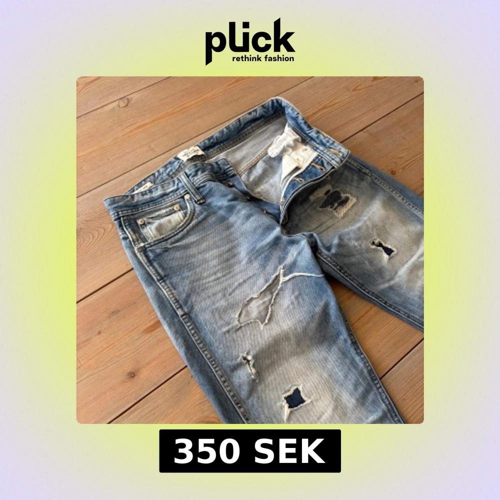 Blå anti fit jeans från Jack n’ Jones i strl 29/32. Sitter som Slim fit och har en sliten look - står ut i mängden. Har igen sydda hål och några fläckar men jeansen är fortfarande väldigt snygga. 🪡Saknar en knapp (se bild) - går eventuellt att fixa🎞️Klassiska vintagejeans 🙌Snygg passform Endast 350! 🚚Fri frakt hela veckan!