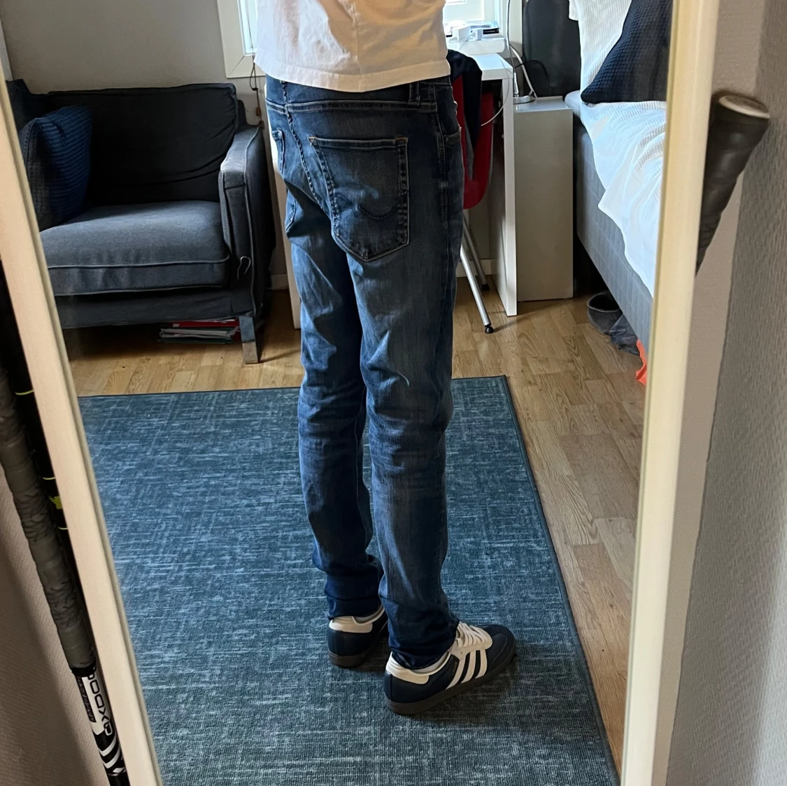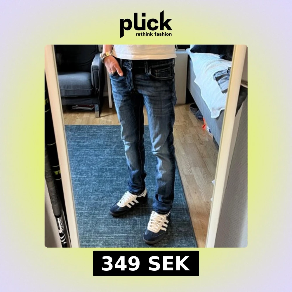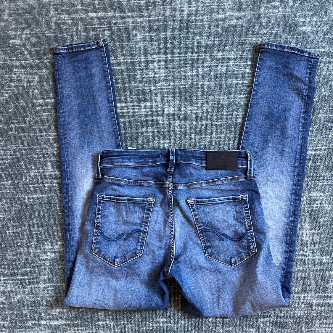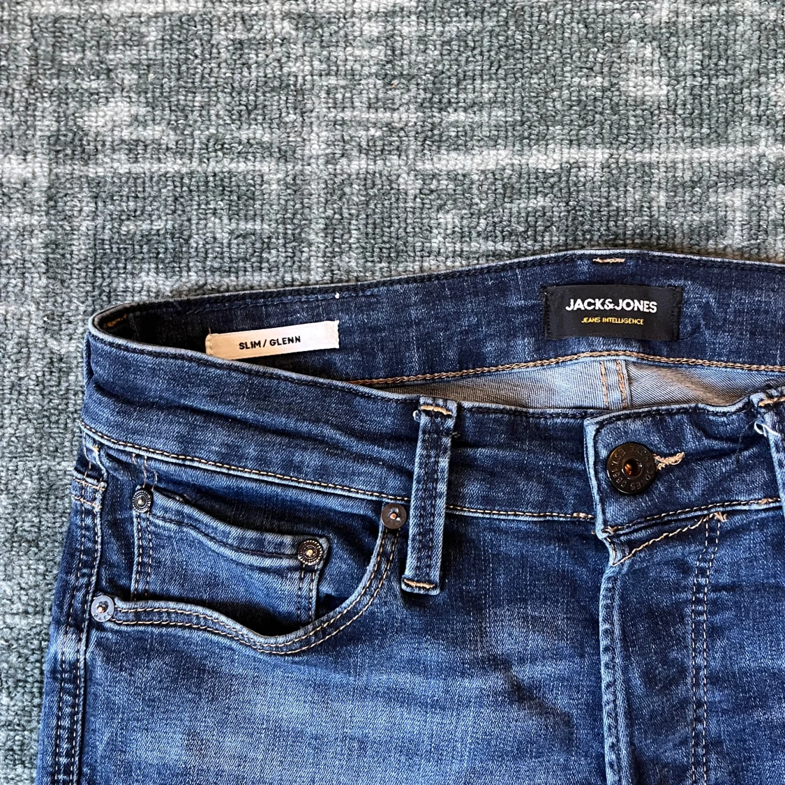 Säljer ett par snygga slim fit jeans från Jack & Jones, modell Glenn. De är blå med lätt slitning och klassisk femficksdesign. Jeansen har normal midja och smal passform hela vägen ner. Perfekta till sneakers och t-shirt.