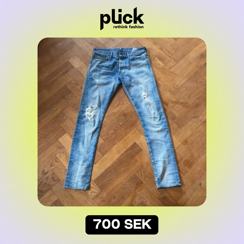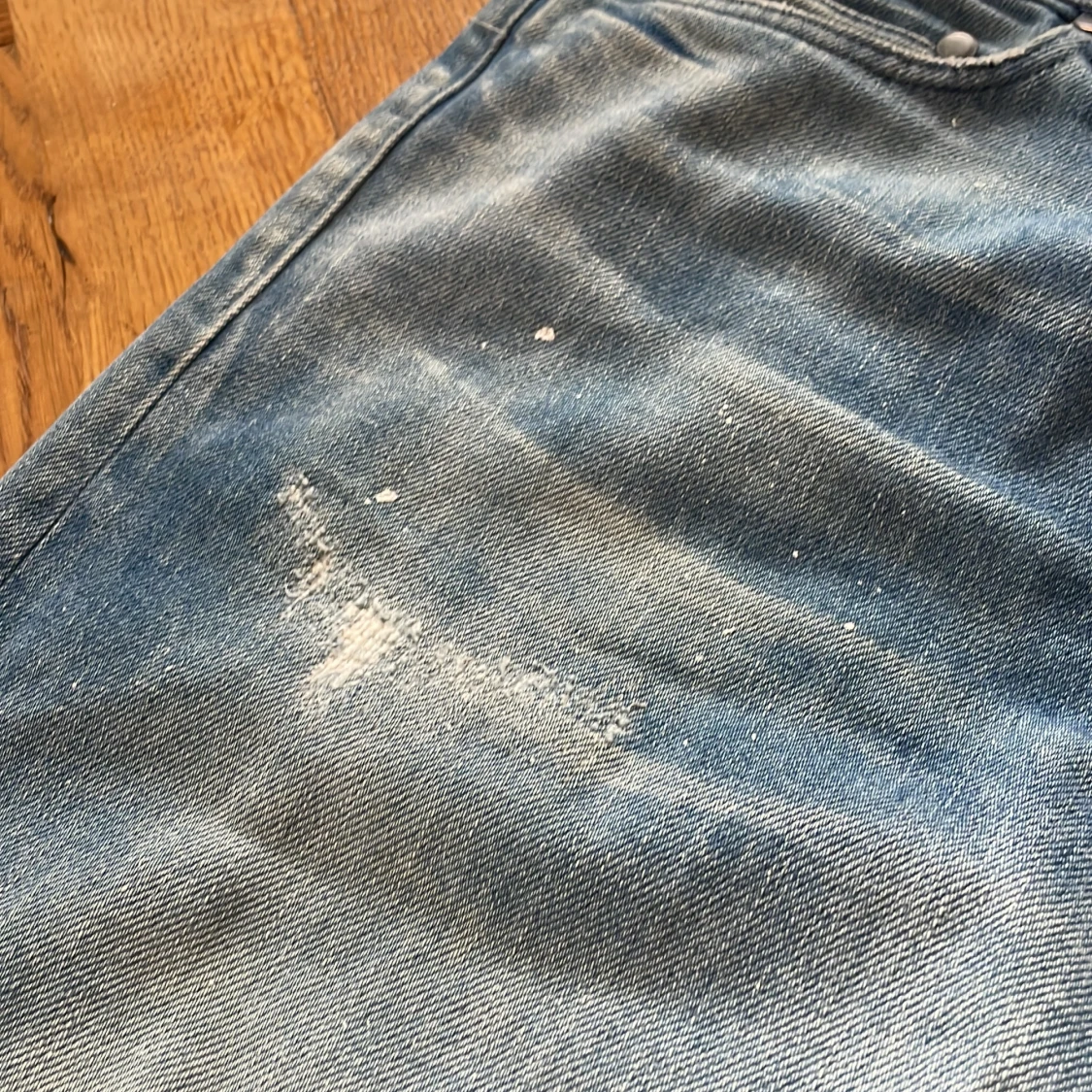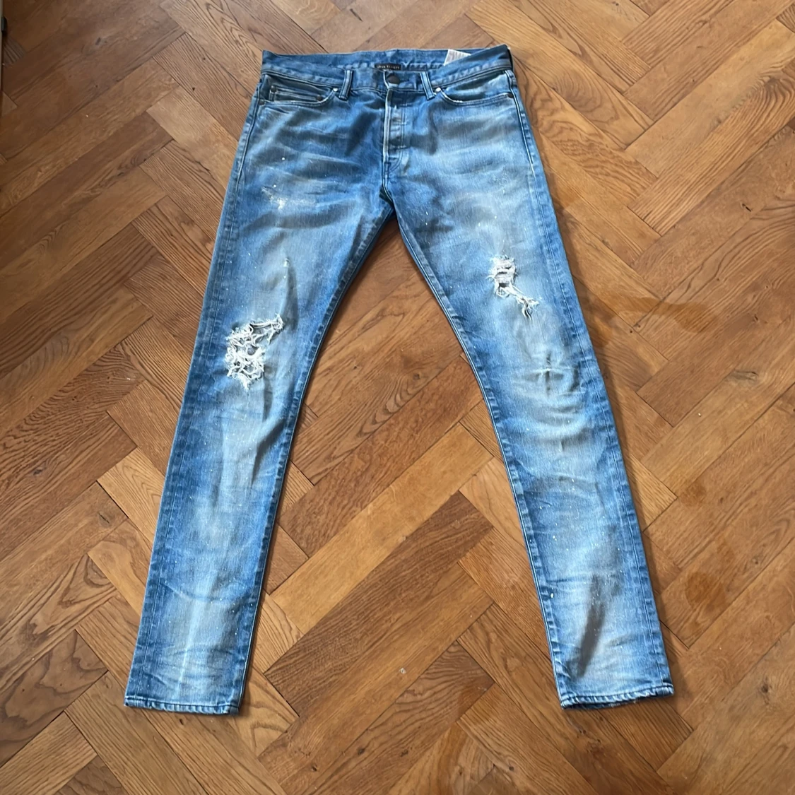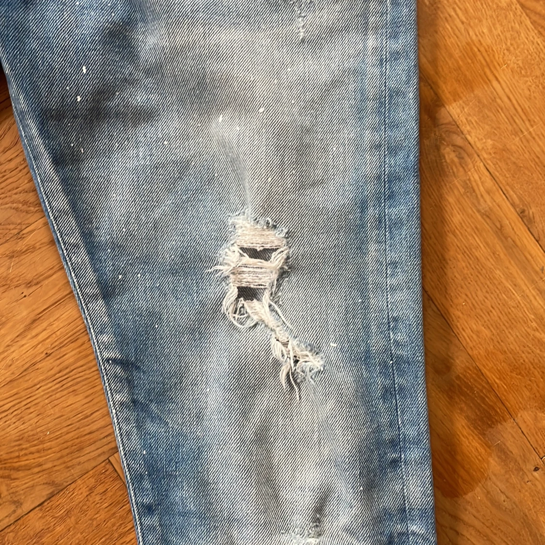 Feta jeans med slitningar och lite färgstänk som design, slim fit. Skick 10/10. Vid minsta lilla fråga är det bara att höra av sig