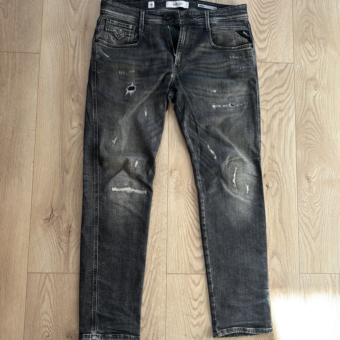 Svarta jeans från Replay med riktigt snygga slitningar. Modellen är Anbass och dom är i strl W32 L30. Det finns ett litet hål i byxorna (se ovan) därav nedsatt pris. Tveka inte på att höra av dig om du har frågor!