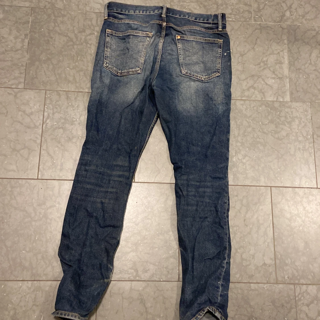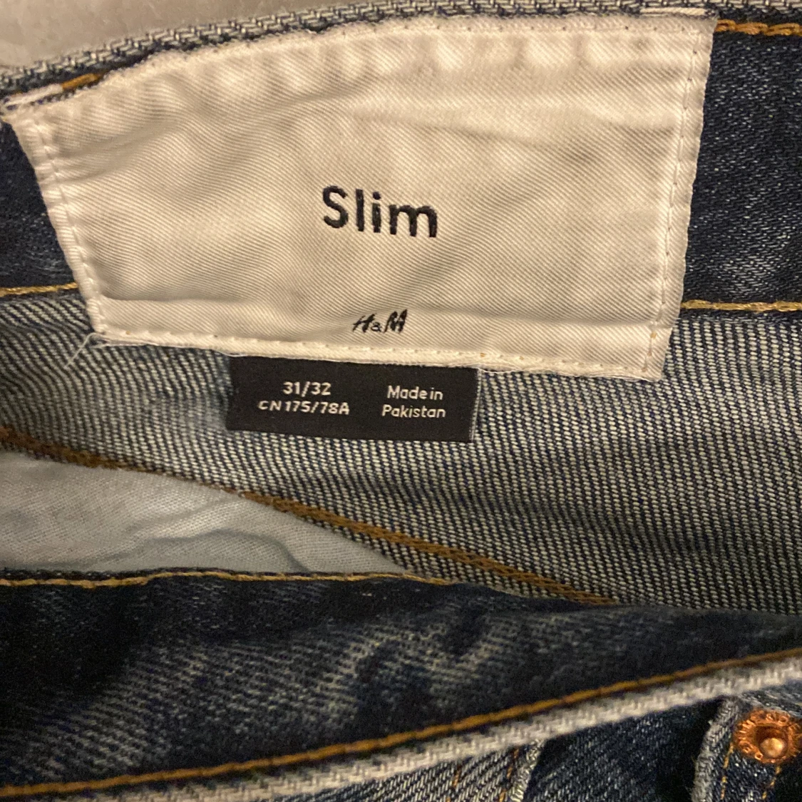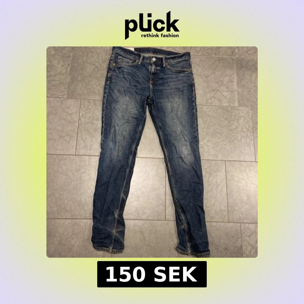 Snygga blå slim fit jeans från H&M i storlek 31/32. Klassisk femficksmodell med smal passform och normal midja. Jeansen har en lätt tvättad look och är tillverkade i bomull med lite stretch för extra komfort.