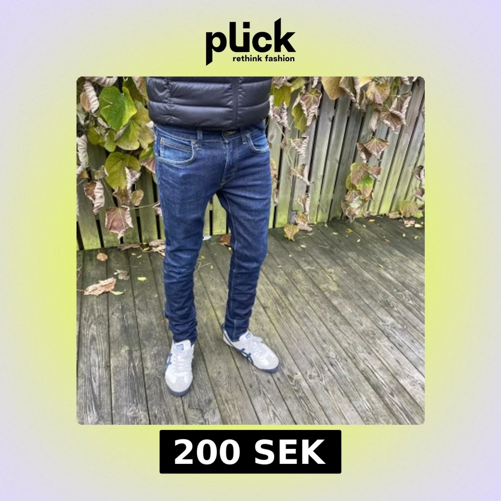 Snygga mörkblå lee jeans med slimfit i modell Luke. Modellen är ca 180