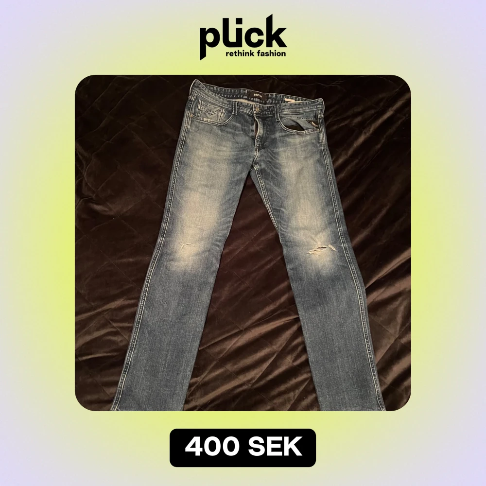 Säljer ett par snygga blå jeansbyxor från Replay, modell Anbass. De har en klassisk femficksdesign och en lätt slitning på framsidan för en cool look. Perfekta för både vardag och fest! 🕺