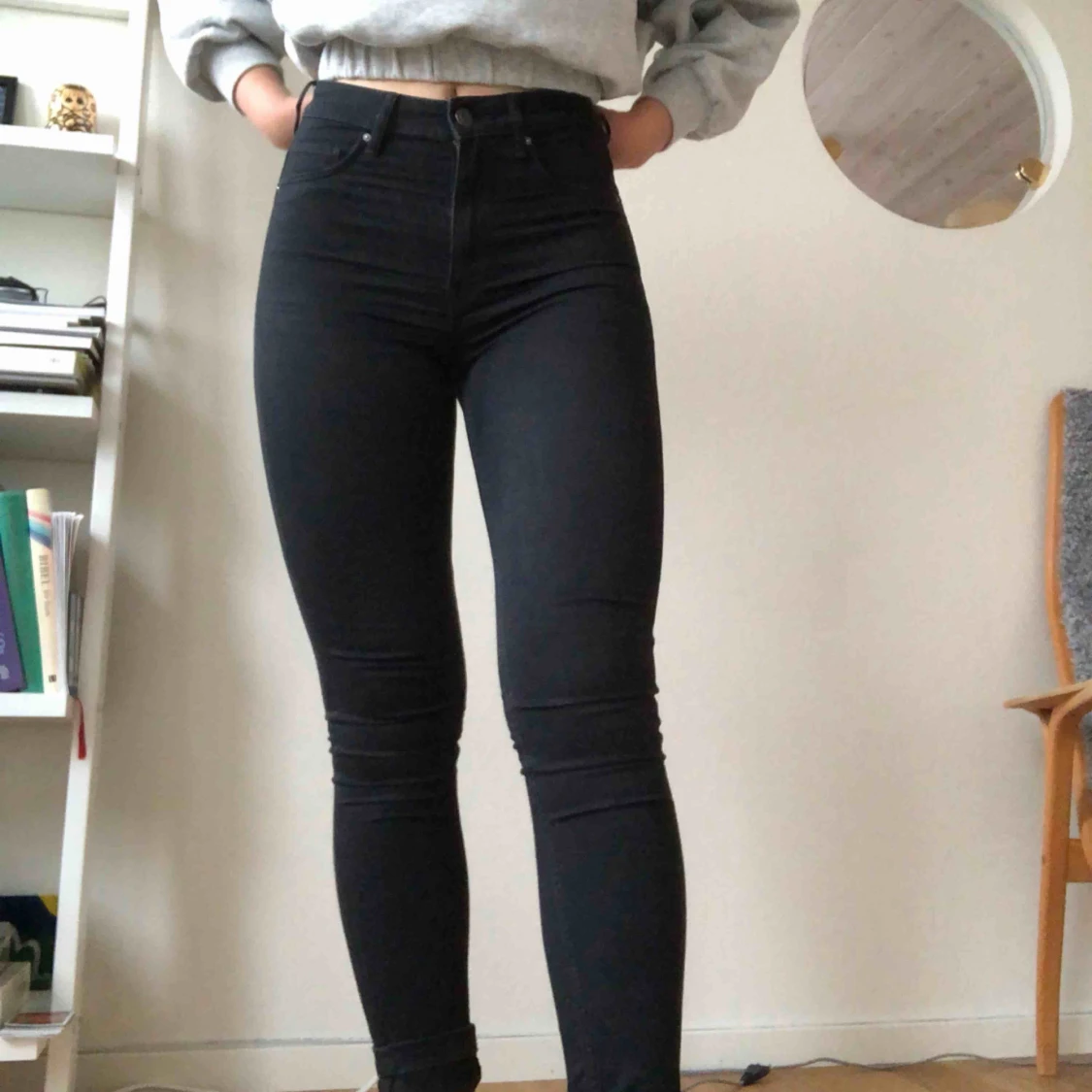 Snygga svarta högmidjade jeans. Passar mig som i vanliga fall är storlek S. Frakt tillkommer!