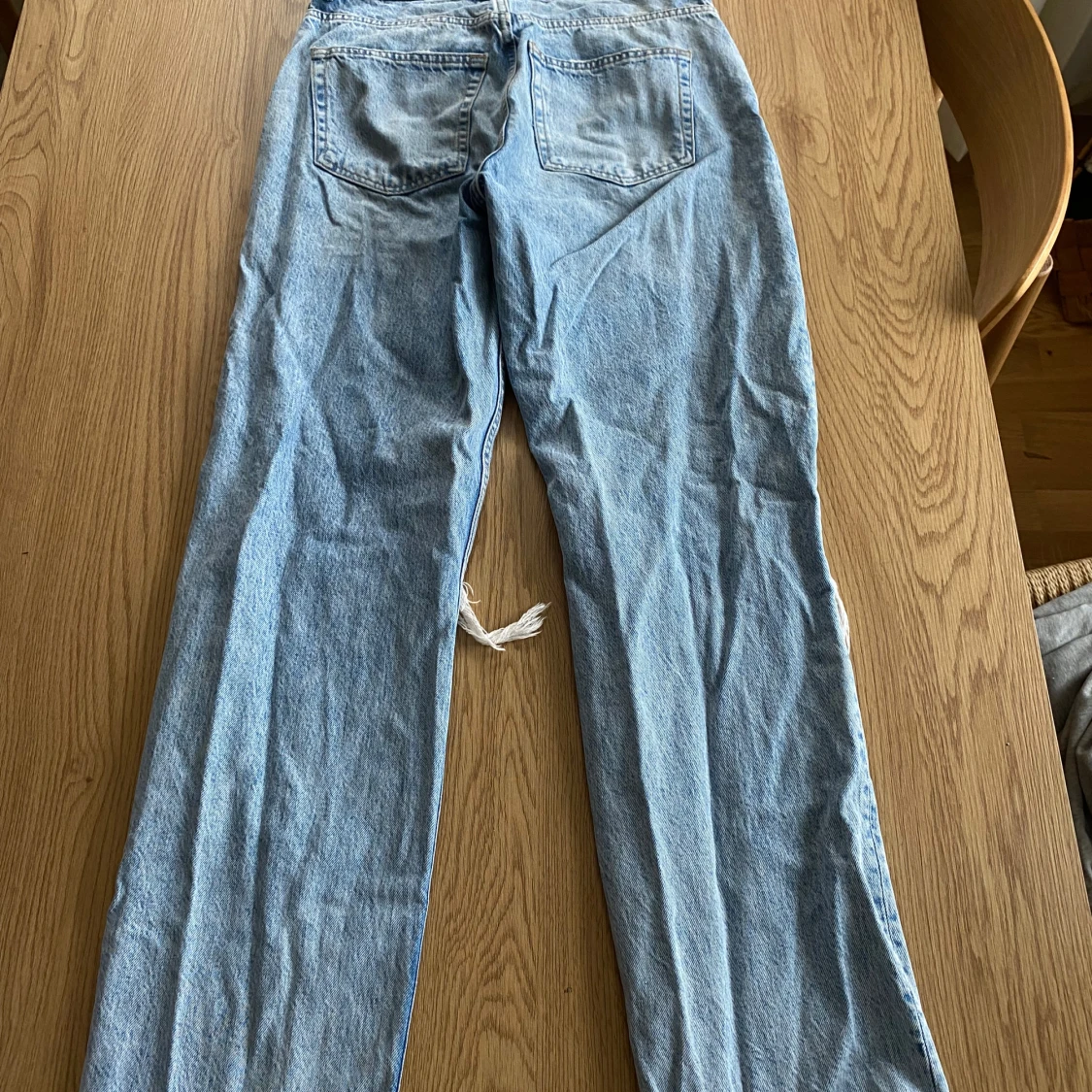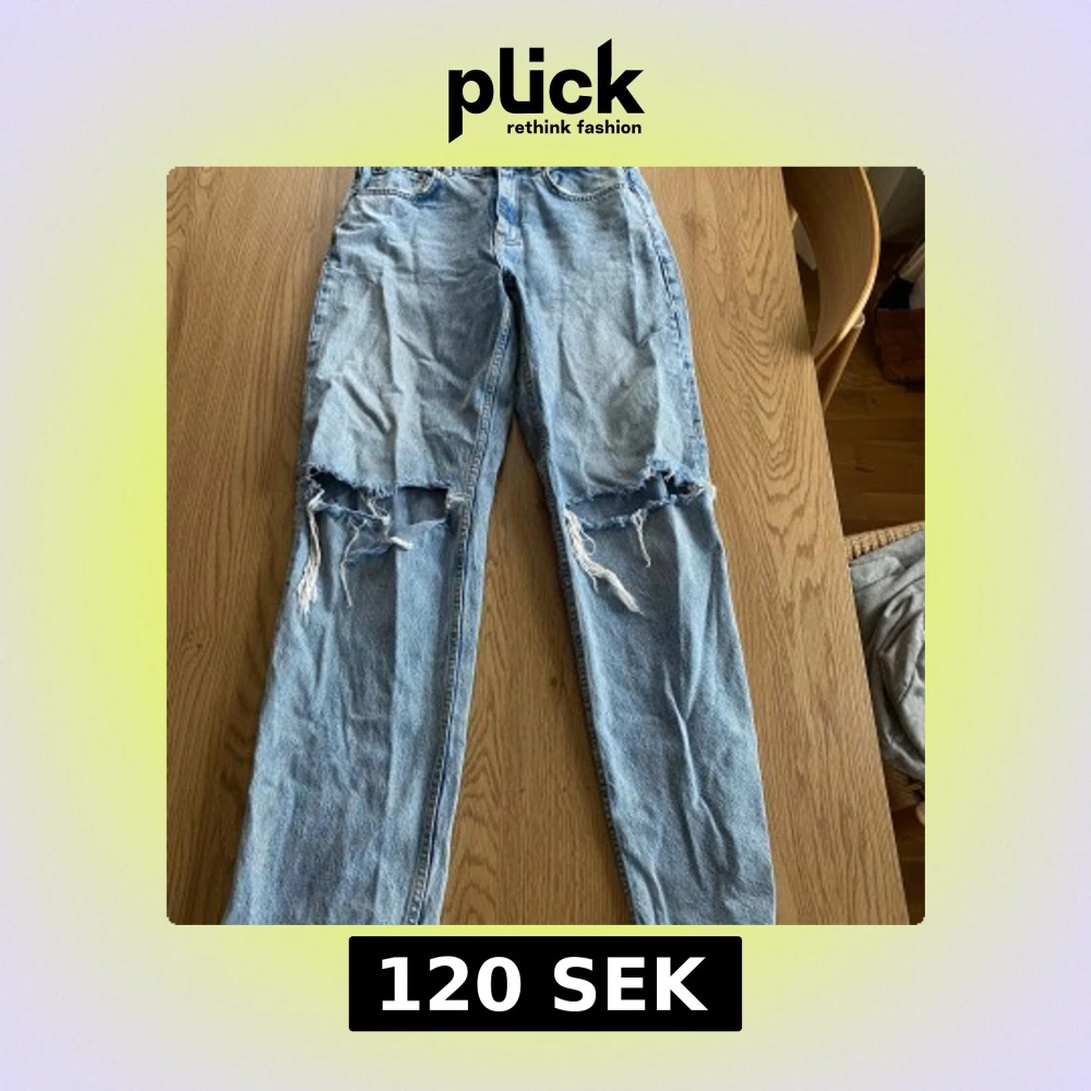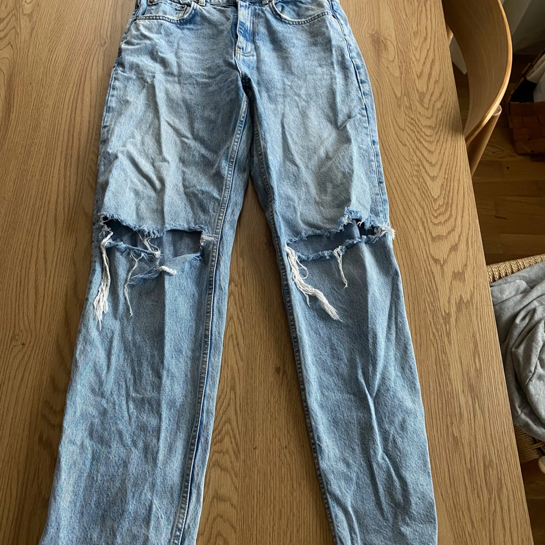 Snygga ljusblå jeans från Gina Tricot med slitna detaljer på knäna. De har en klassisk femficksdesign och är tillverkade i hållbar bomull. Perfekta för en avslappnad stil.