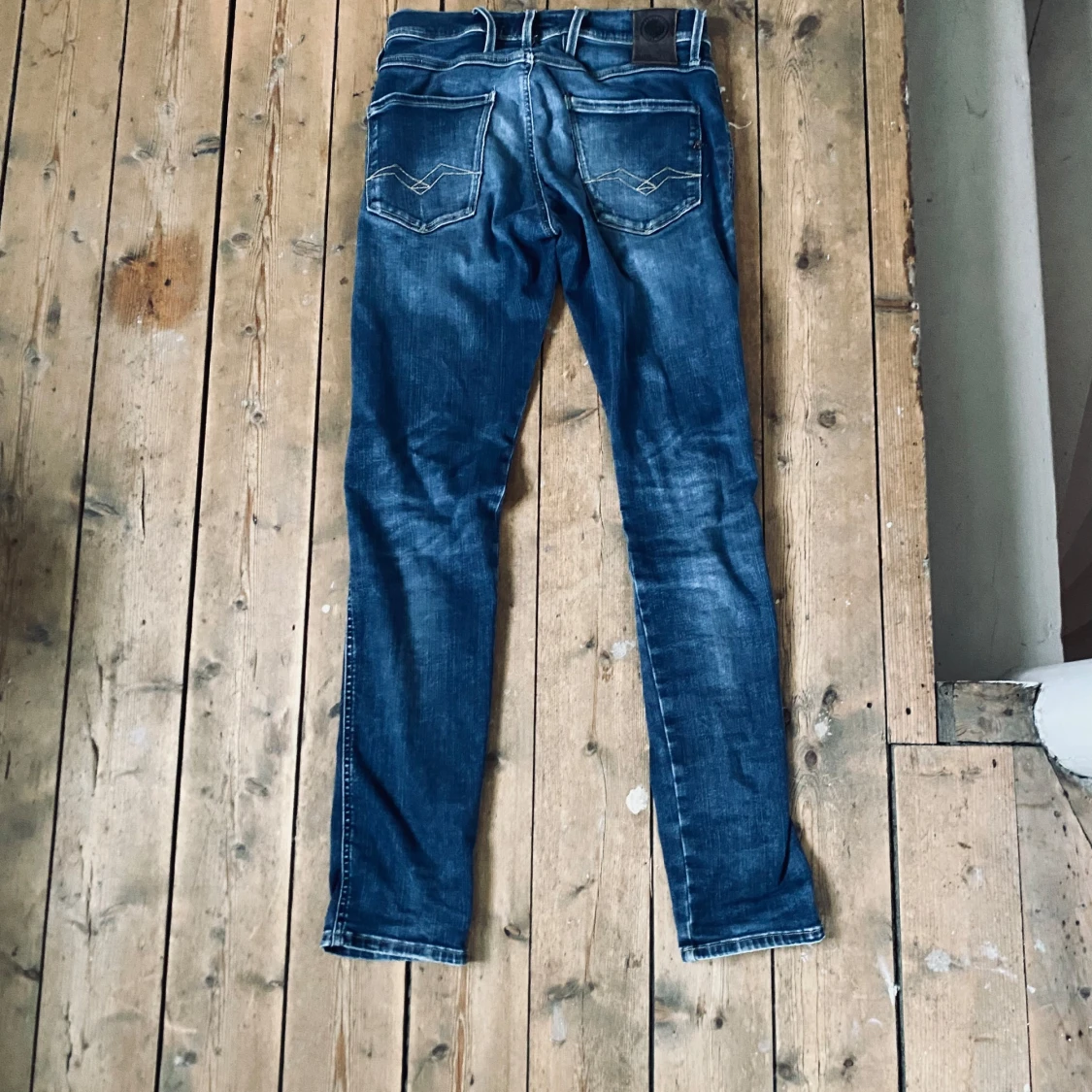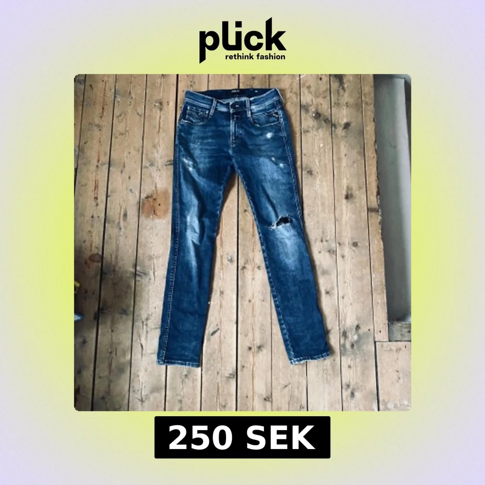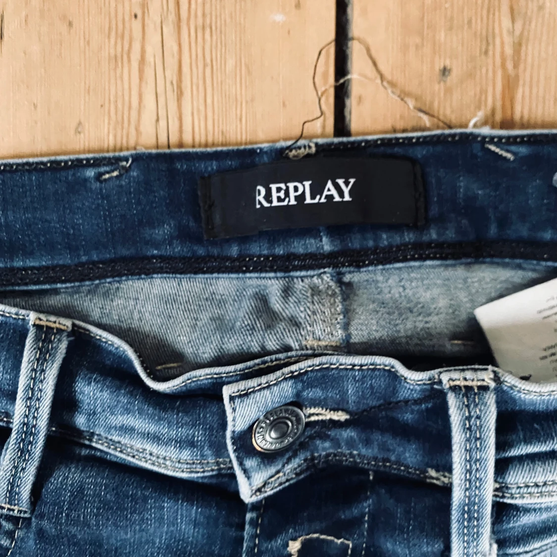 Säljer ett par blå jeans från Replay med snygga slitningar och hål på ena benet. Klassisk femficksmodell med raka ben och normal passform. Säljer pga att de blivit för små. Perfekta för en avslappnad stil.