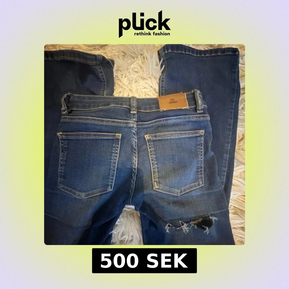 Säljer ett par blå jeans med slitningar på ena benet lågmidjade jeans.
