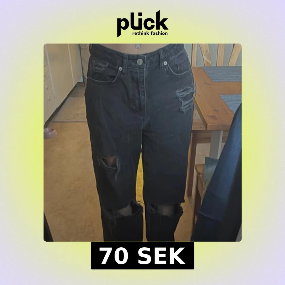 Snygga svarta jeans från NA-KD med slitningar på knäna och en hög midja. De har en loose passform och klassiska femficksdetaljer. Perfekta för en avslappnad stil. Bekväm, och bra skick förutom att slitningarna har gått upp.