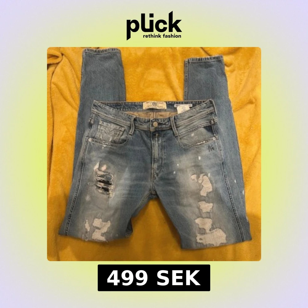 Säljer ett par blå jeans från Anbass med en slim fit passform. De har en cool slitningseffekt på framsidan och klassiska femficksdetaljer. Perfekta för en avslappnad stil.