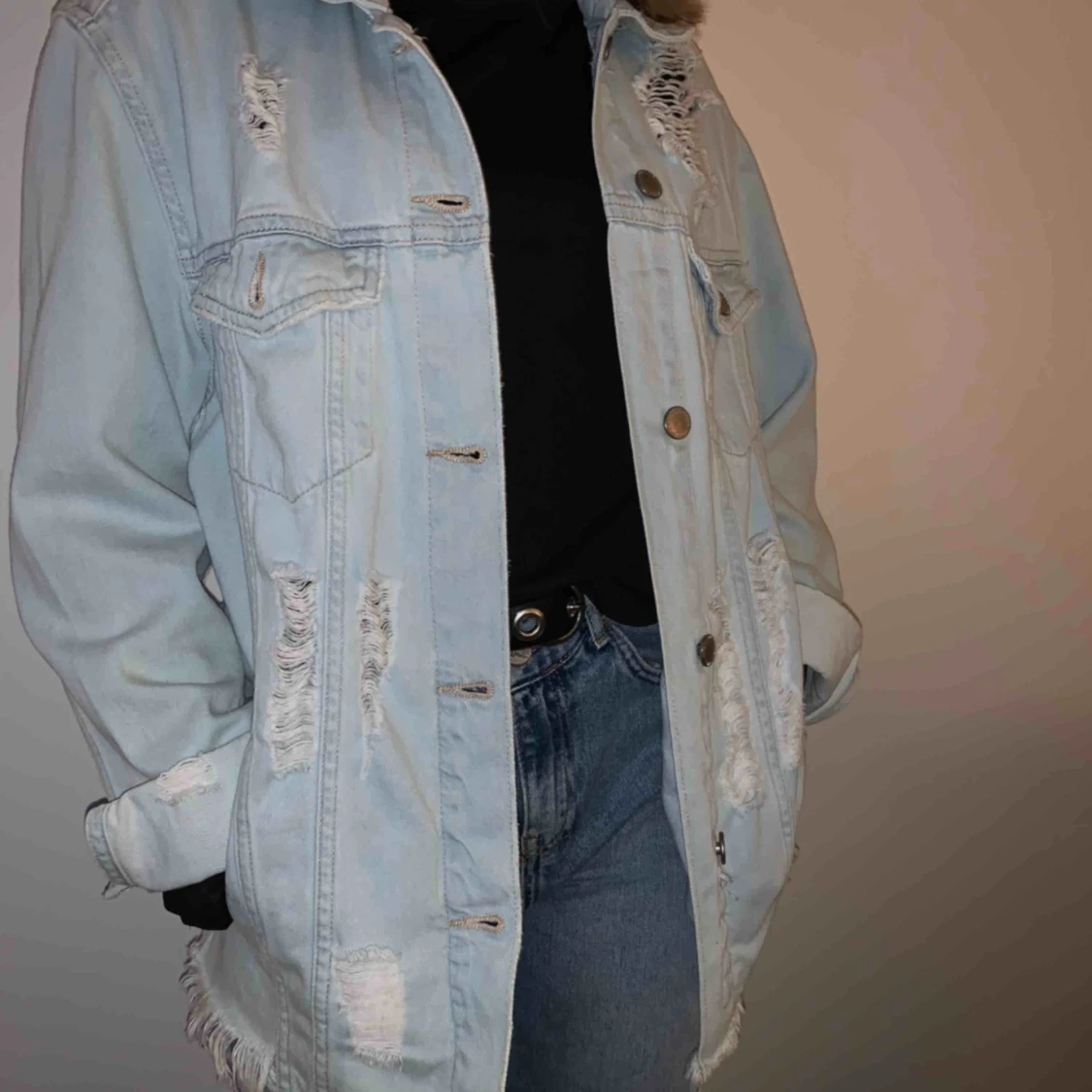 Jeansjacka med slitningar från H&M. Skit cool men har inte kommit till användning. Storlek s men modellen är lite oversized.