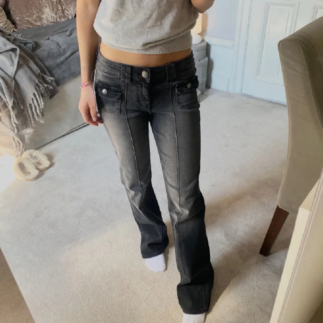 Slutsålda jeans från hm. Storlek 36, säljer då de är för stora för mig. Sista bilden är lånad och där ser jeansen gråare ut än vad de är. De är helsvarta, vilket syns bäst på andra bilden.