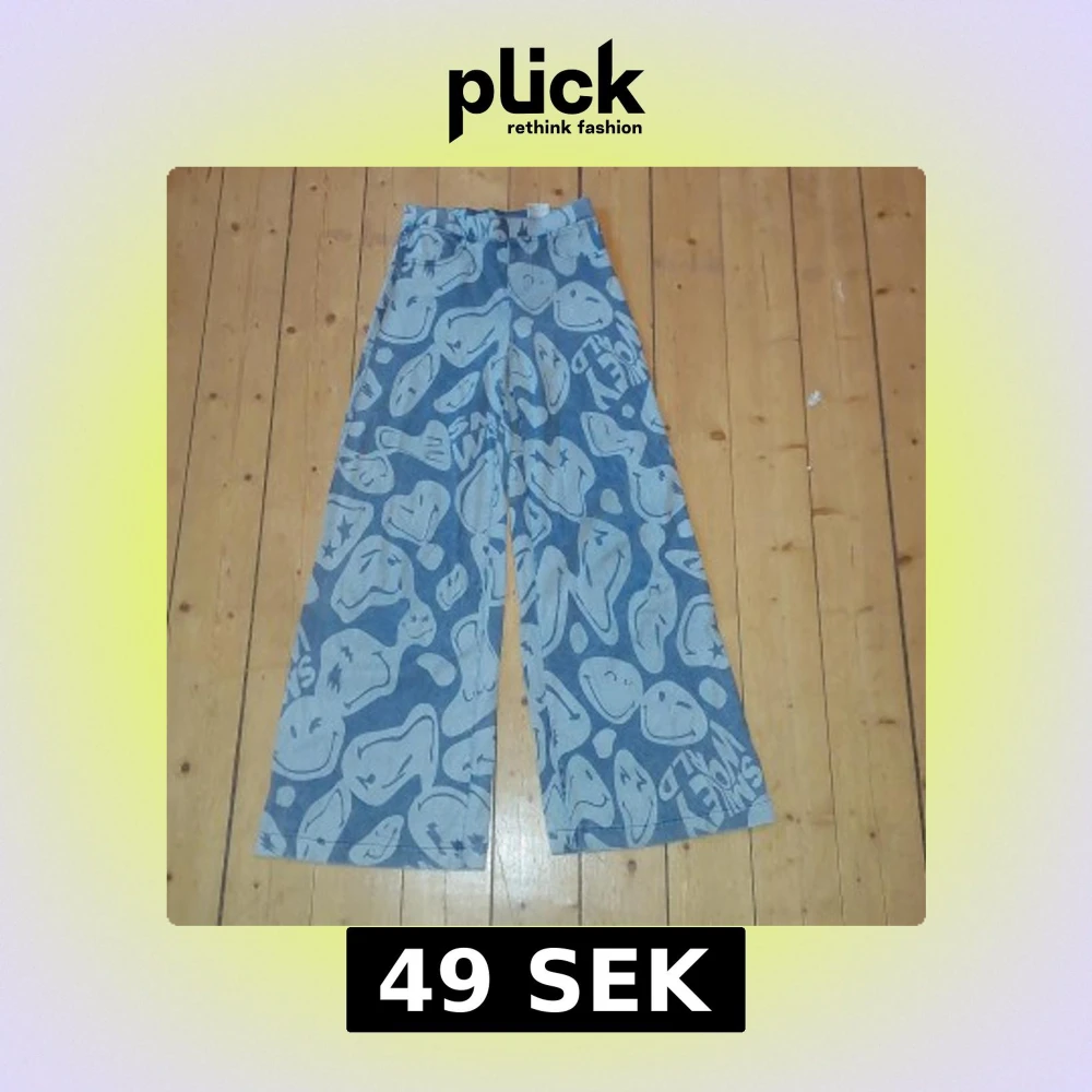 Coola blå byxor från H&M med ett unikt smiley-mönster över hela tyget. Byxorna har en loose passform och är perfekta för en avslappnad stil. De har elastisk midja för extra komfort.