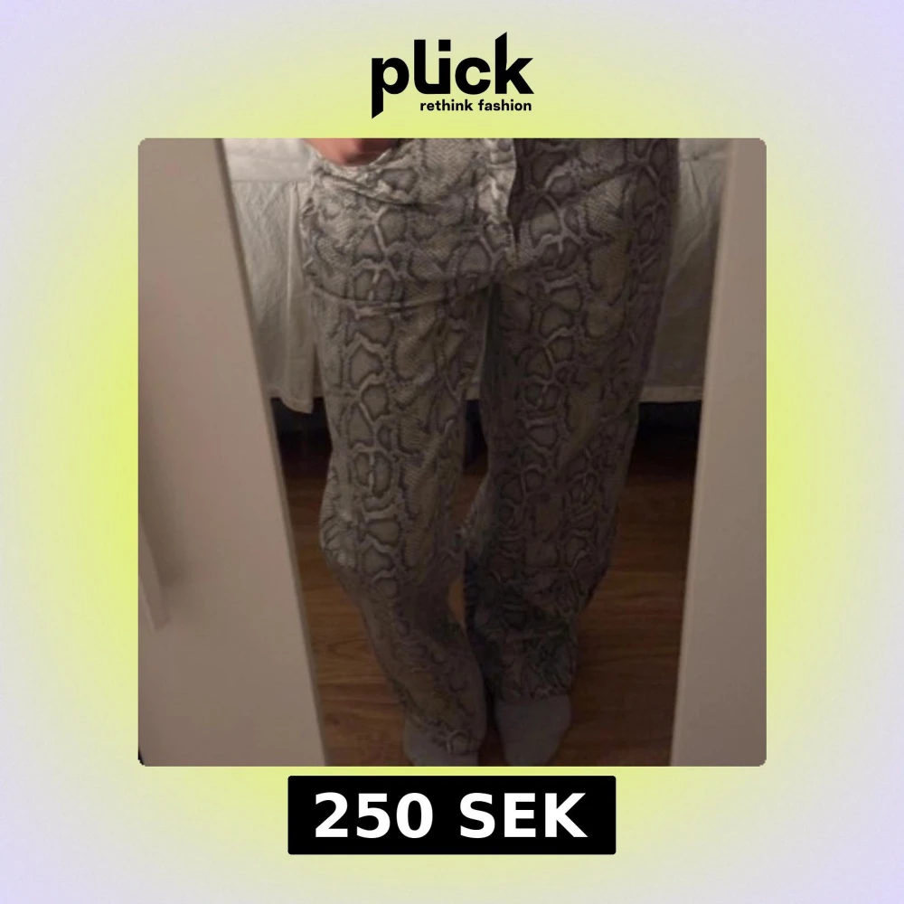 Säljer ett par gråa byxor med ormmönster och normal passform. Byxorna har hög midja och raka ben, perfekta för dig som vill sticka ut lite extra. Stängs med knappar och dragkedja framtill.
