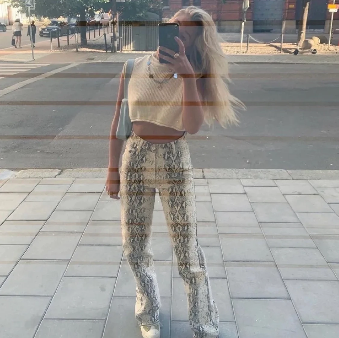 (Lånad bild) jättefina jeans som är full lenght med ormmönster på. Säljer då de är försmå. Endast använda en gång!