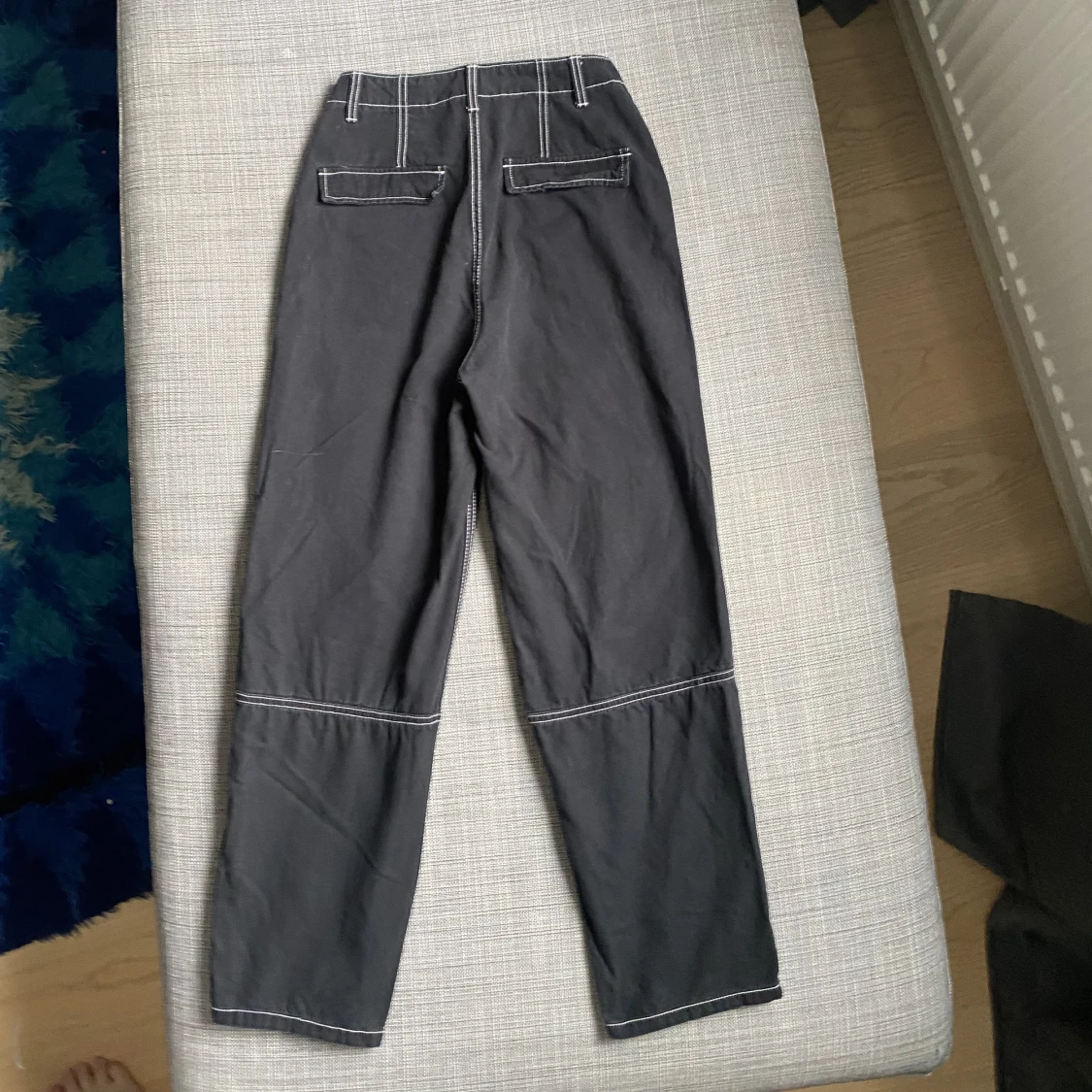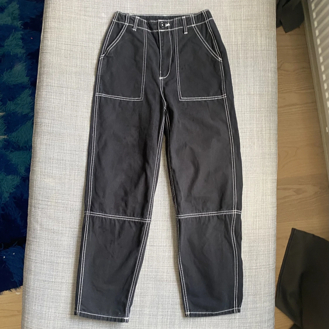 Snygga svarta cargobyxor i strl 32. De är fint skick. Säljer de då de är alldeles för små och korta på mig som är 170cm💌