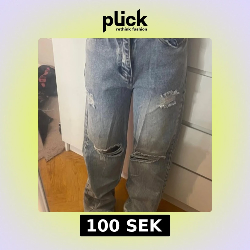Säljer ett par blåa jeans med bred passform och slitna detaljer på knän och benslut. Jeansen har hög midja och klassisk femficksdesign. Perfekta för dig som gillar en avslappnad och trendig stil med mycket attityd.💕💕pris kan diskuteras