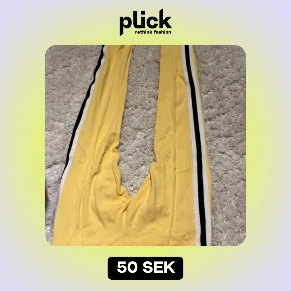 Ett par gula mjukisbyxor med snygga svart vita ränder på sidan! Använts fåtal gånger.