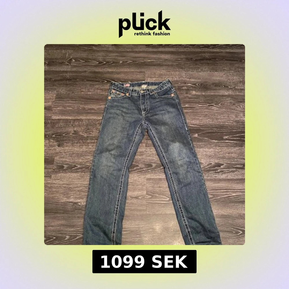 Säljer ett par blå True Religion Joey Super T jeans med kontrasterande vit söm och stora bakfickor med lock och knapp. Använd 5 gånger och ser nya och är nya å har fortfarande prislapp, Klassisk femficksmodell i jeansmaterial med tydlig logga bak. Snygg passform och coola detaljer som sticker ut.