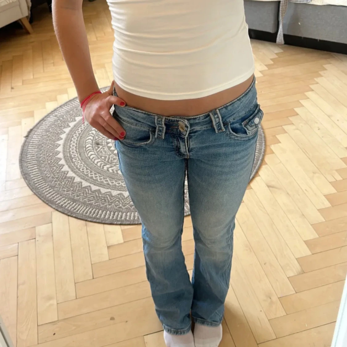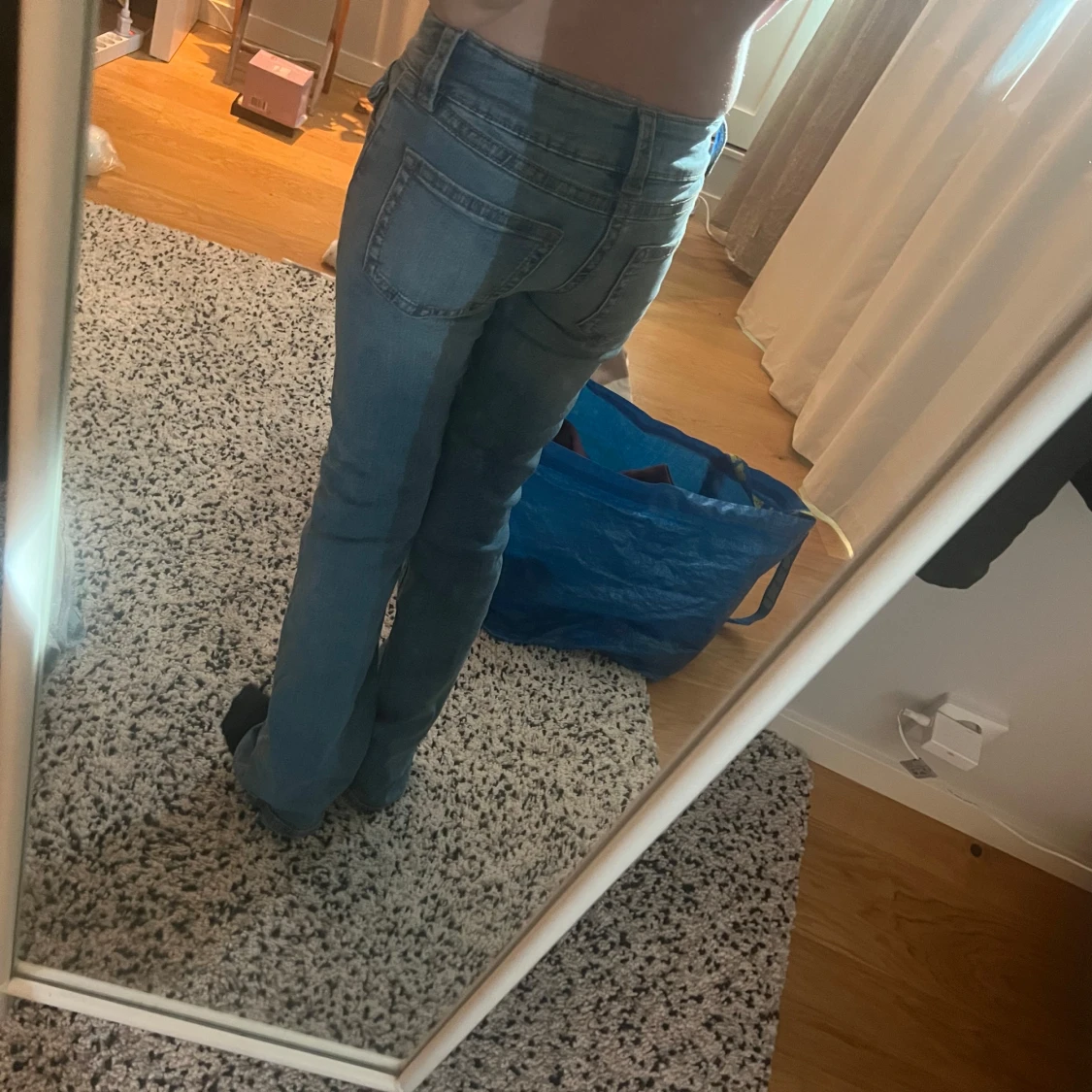 Snygga blå jeans med bootcut-stil och klassisk femficksdesign, de är även low waist. Perfekta för en avslappnad look. De har en bekväm passform och är tillverkade i ett slitstarkt denimtyg.💕💕 används typ 2 ggr. Lånad bild