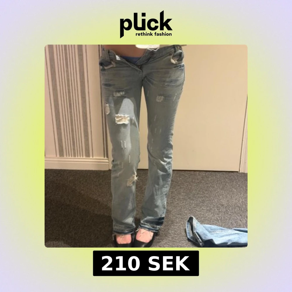 Säljer ett par ljusa jeans med hål för en trendig look. De har en normal passform och är perfekta för en avslappnad stil. Jeansen har klassisk femficksdesign och knappgylf. Gylfen är öppen för att dem ej passar! Älskar hålen!! Pris kan diskuteras!!
