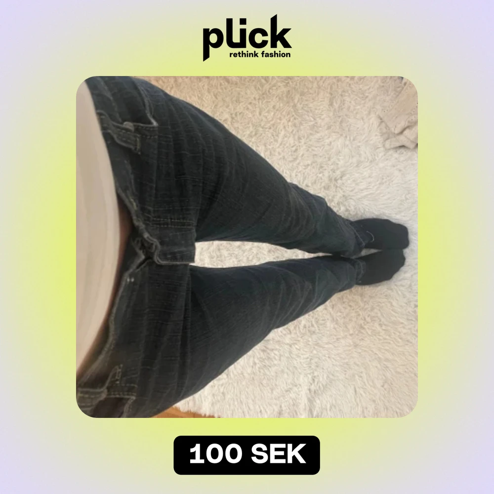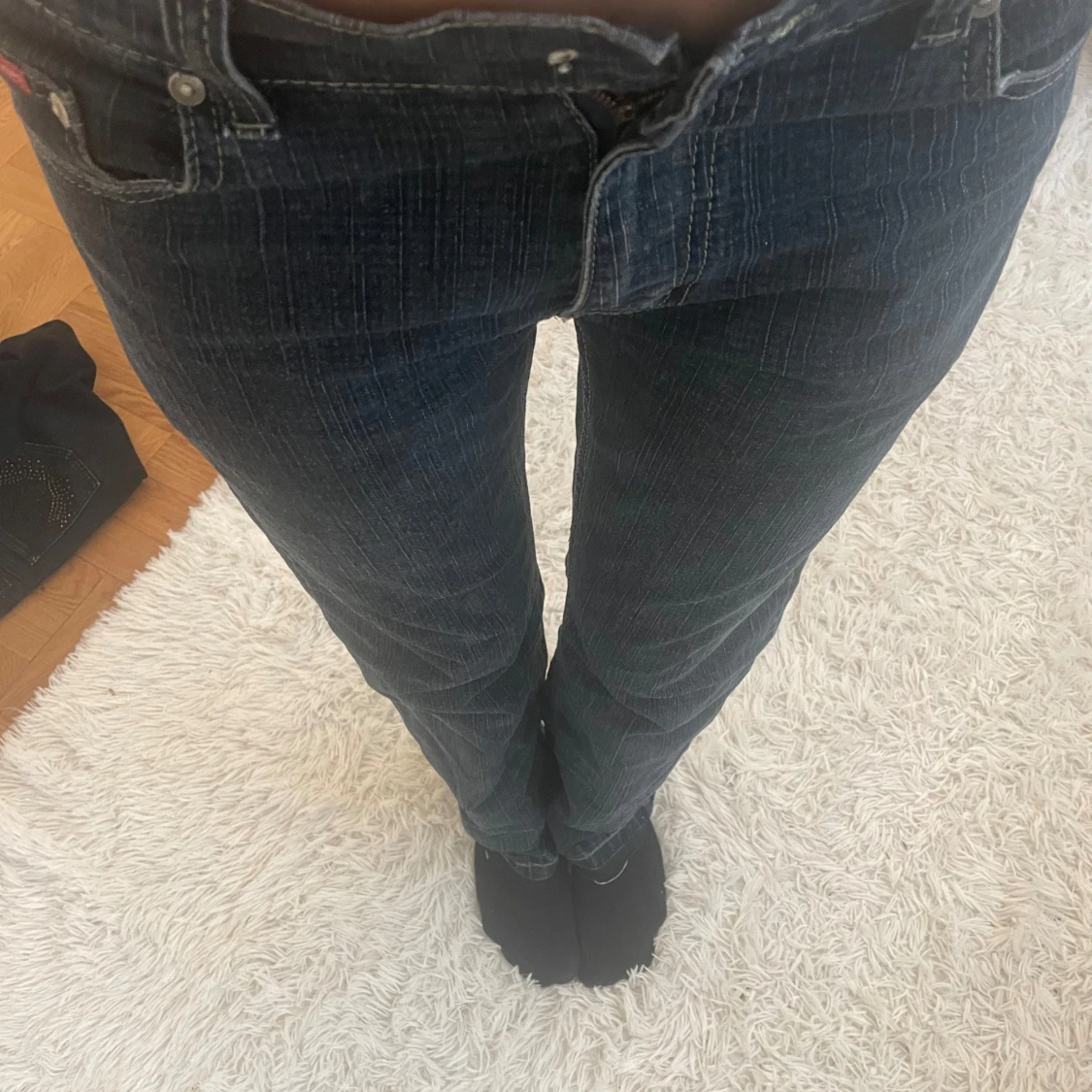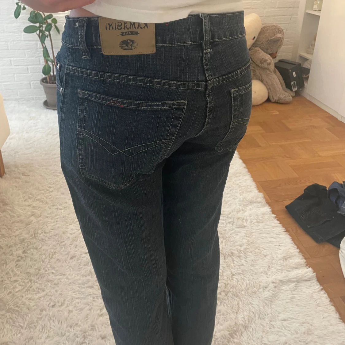 Jätte fina jeans i mörkblått köpte på second hand. Obs knappen är trasig men går att sy fast en ny💓☺️midja 40-42cm, jeansen är långa jag är 180🥰
