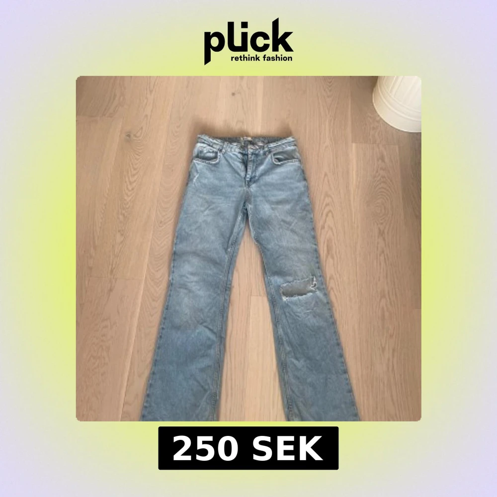 Snygga midwaist blå jeans från Gina tricot med ett hål på ena knät.🥰 De har blivit lite söndertrampade se bild 5! Perfekta för en avslappnad stil. Skriv för bild på!!❣️❣️