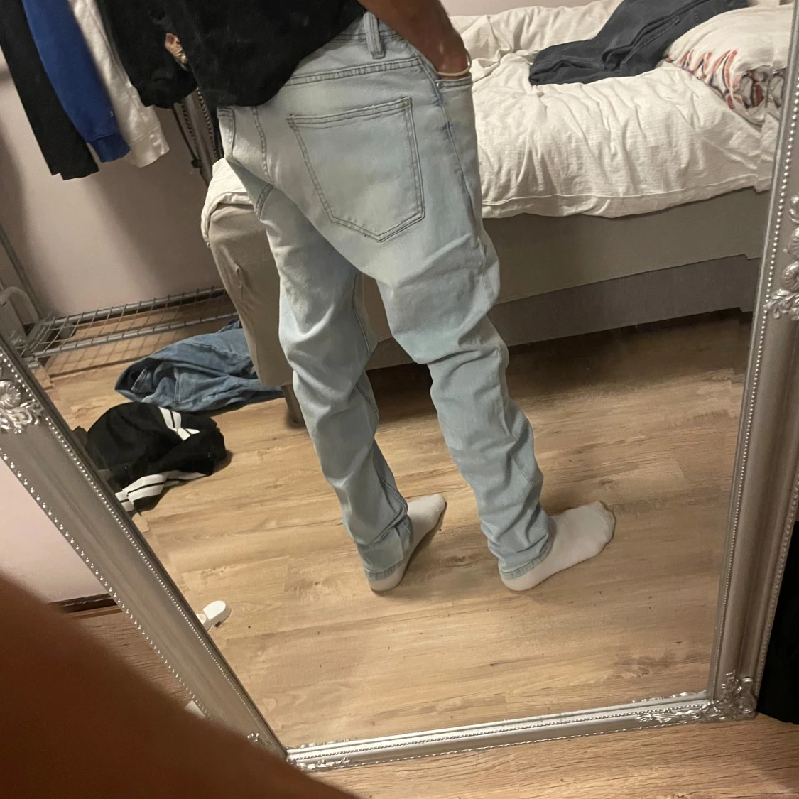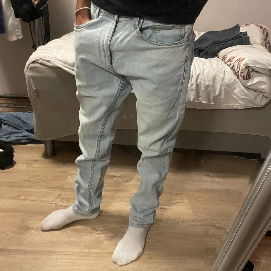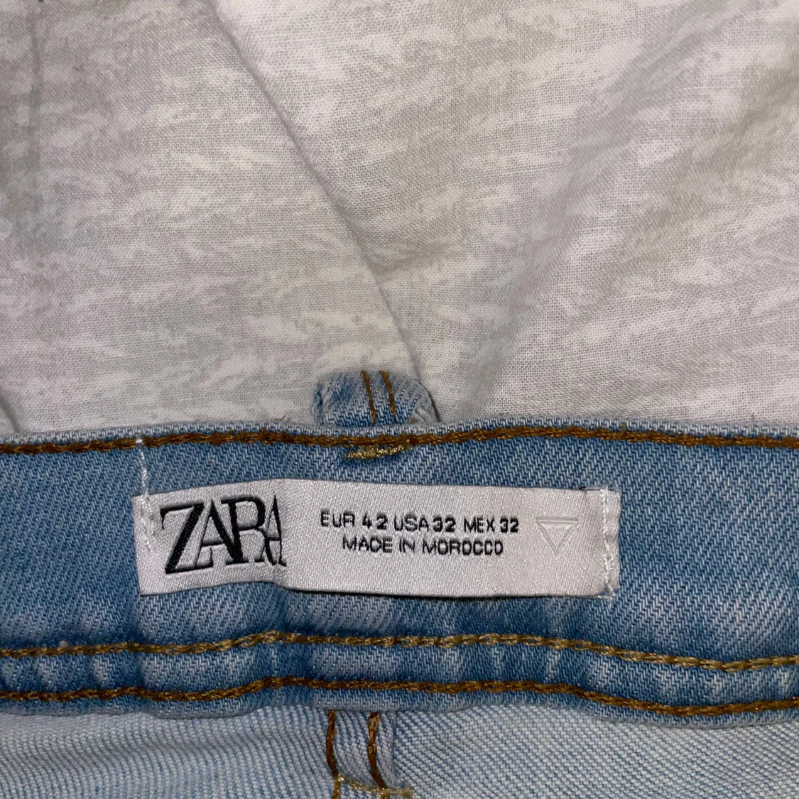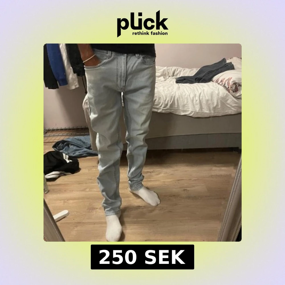 Säljer ett par ljusblå jeans från Zara i storlek 32. Jeansen har klassisk femficksdesign, raka ben och normal passform. Tillverkade i mjukt denimtyg som är skönt att bära. Perfekta för dig som gillar en clean och enkel look.