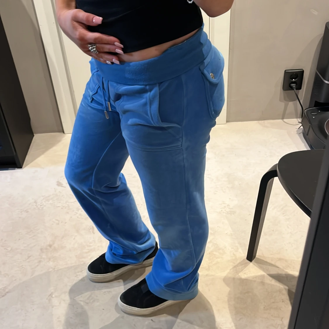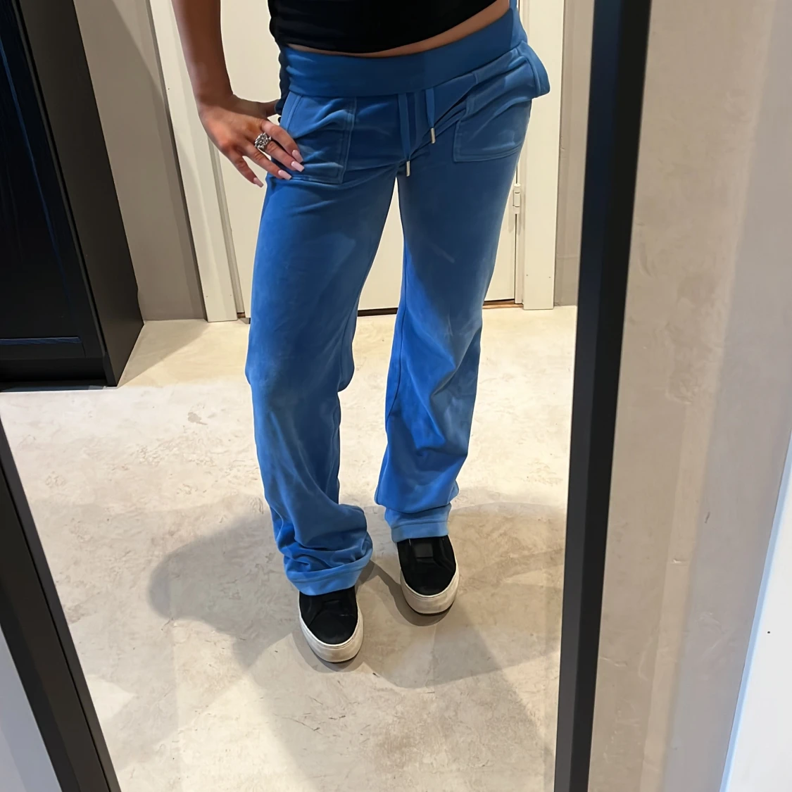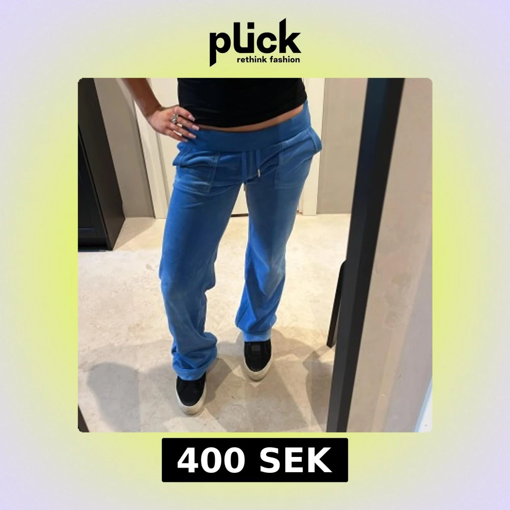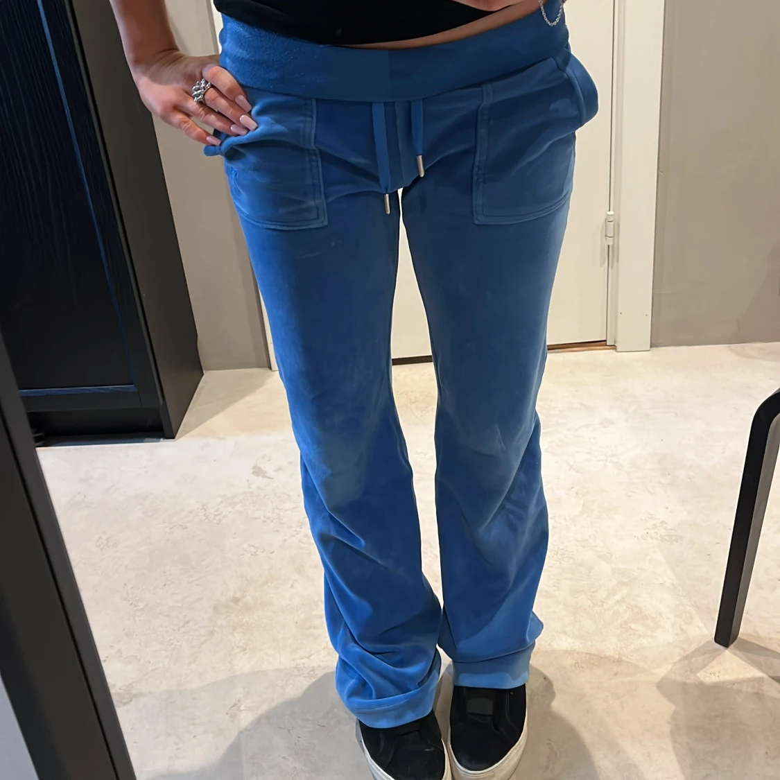 Snygga blå mjukisbyxor i mjukt velourmaterial med bred midja och snörning framtill. Byxorna har raka ben, stora fickor och en avslappnad passform som ger en chill vibe. Perfekta för att hänga hemma eller dra till stan med kompisarna. Skriv innan köp!!❤️
