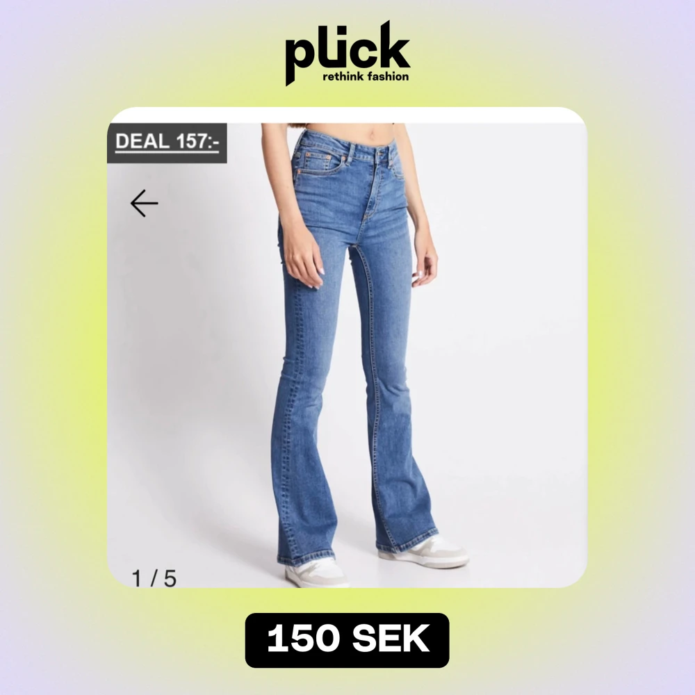 Säljer ett par snygga blå bootcut jeans i mycket bra skick. De är högmidjade och har en klassisk femficksdesign med dragkedja och knapp. Perfekta för både vardag och fest! Passar bra med sneakers eller klackar för en stilren look.