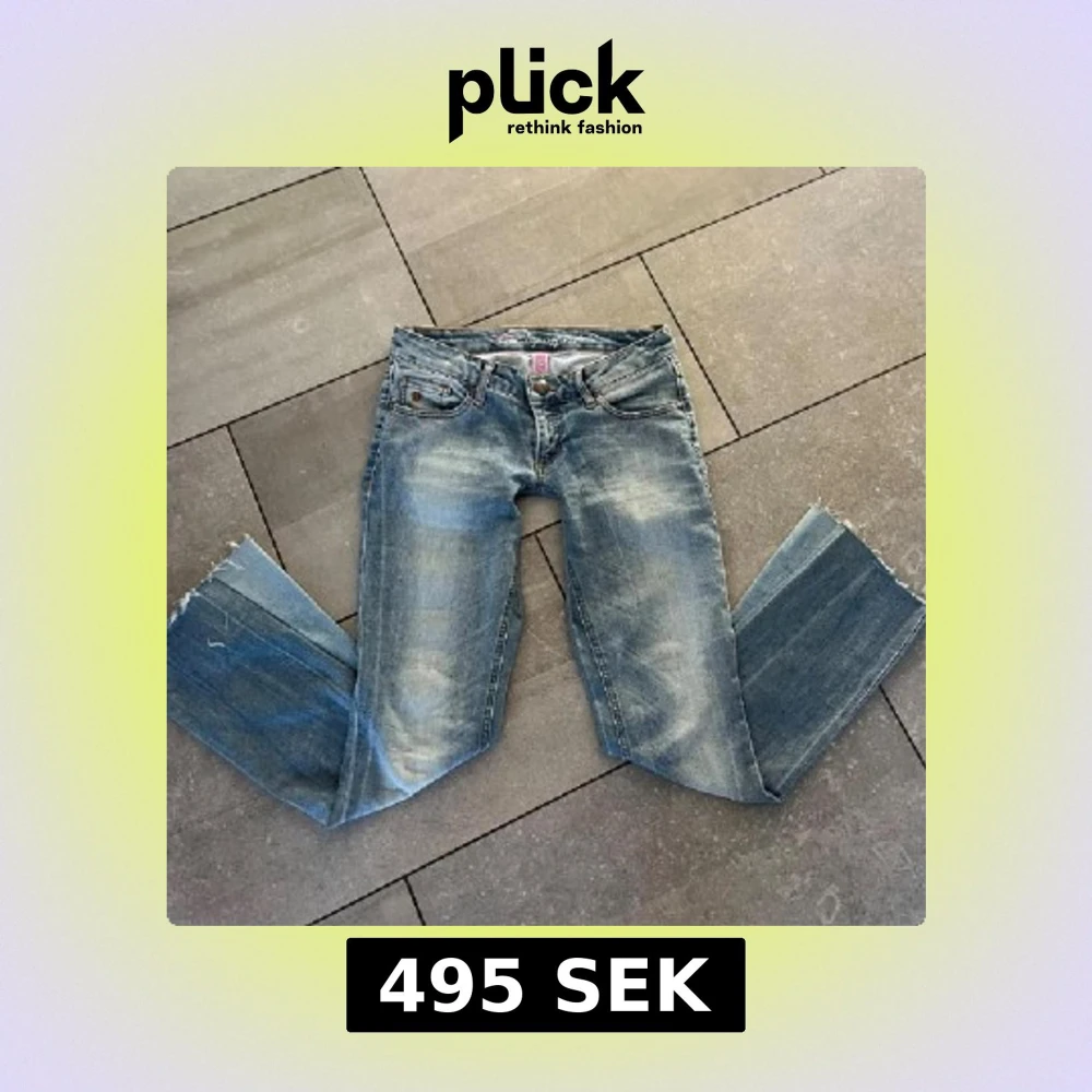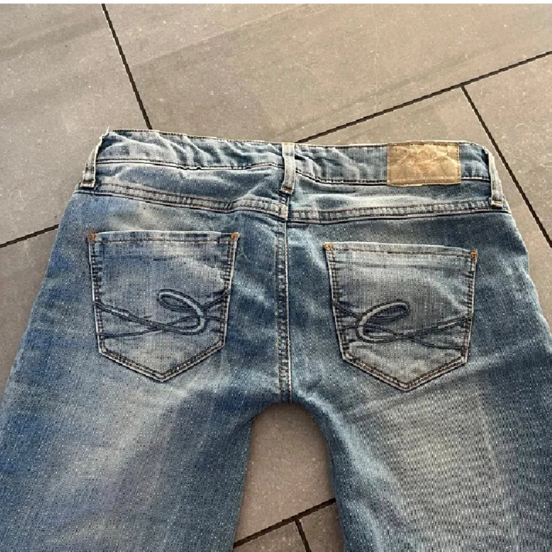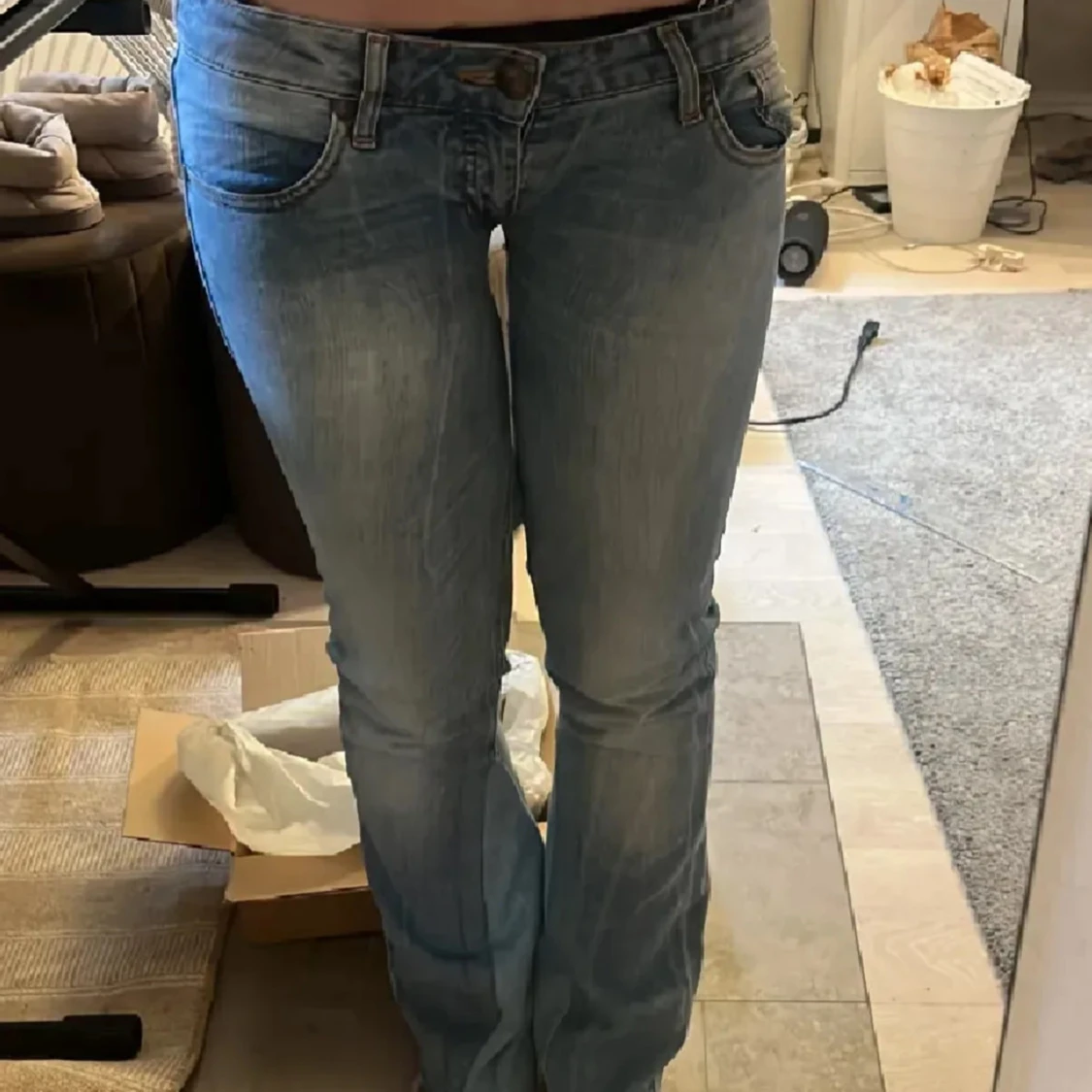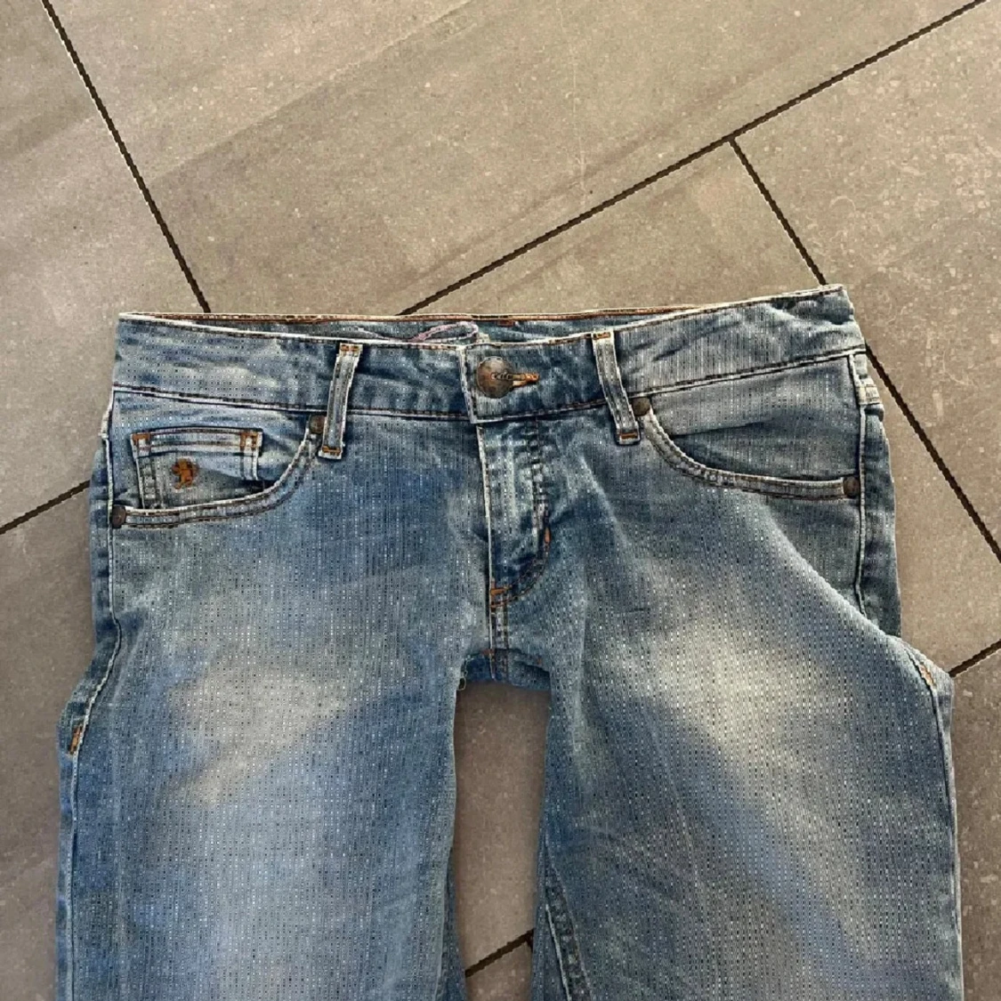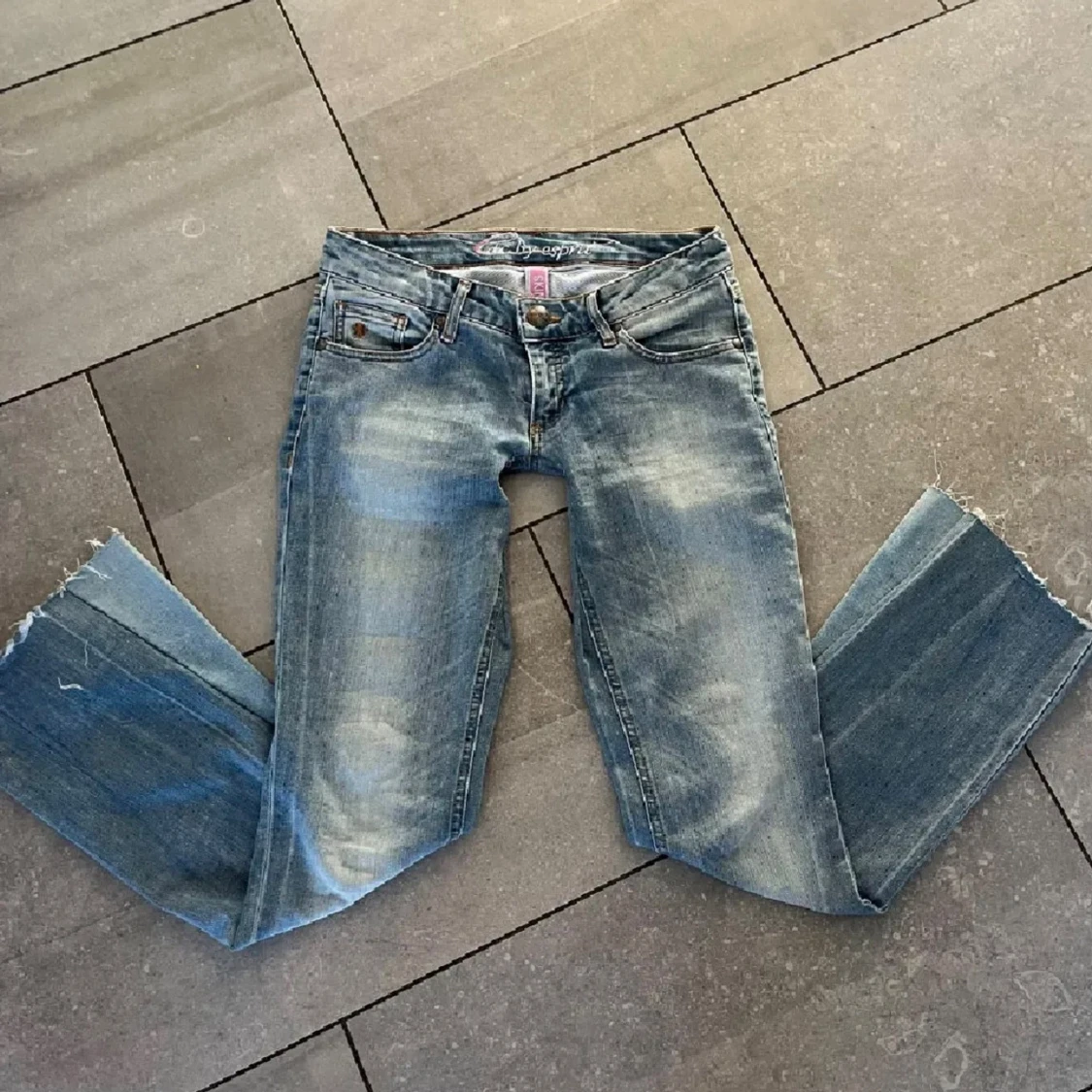 Snygga ljusblå jeans med bootcut passform och slitna detaljer. Jeansen har klassisk femficksdesign, låg midja och coola broderade bakfickor. Säljer pga dom inte passar mig, förra ägaren sydde ner dom så dom är extra lågmidjade. Inrebenmått ca 75 midjemått ca 40. Skriv vid frågor eller intresse🥰🥰