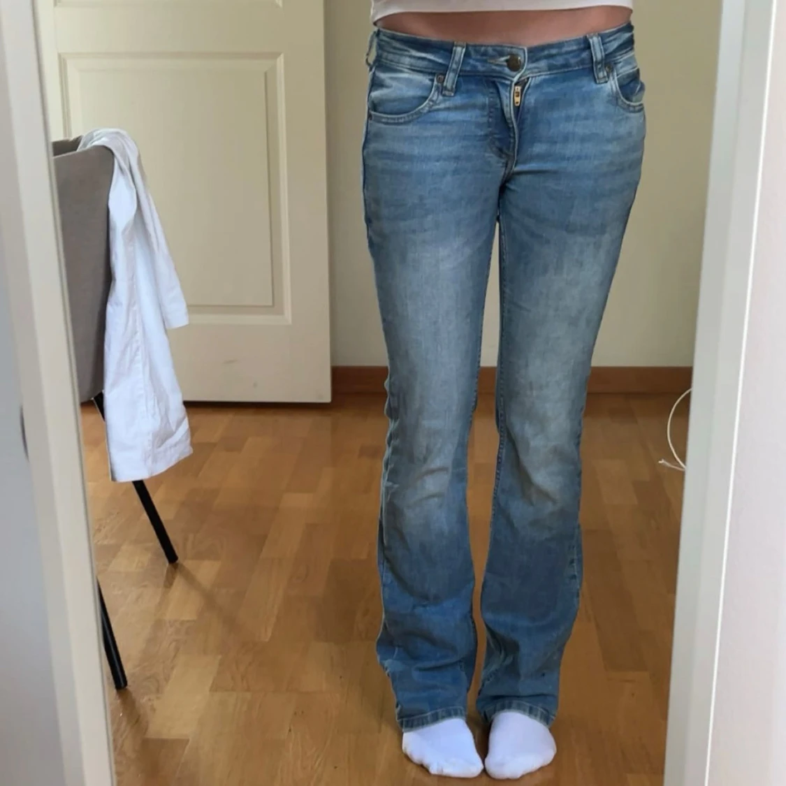 Säljer ett par ljusblå jeans från Lee med bootcut-modell och låg midja. Basic och snygga. Storleken är W24 L31. Pris kan diskuteras 🩵🩵