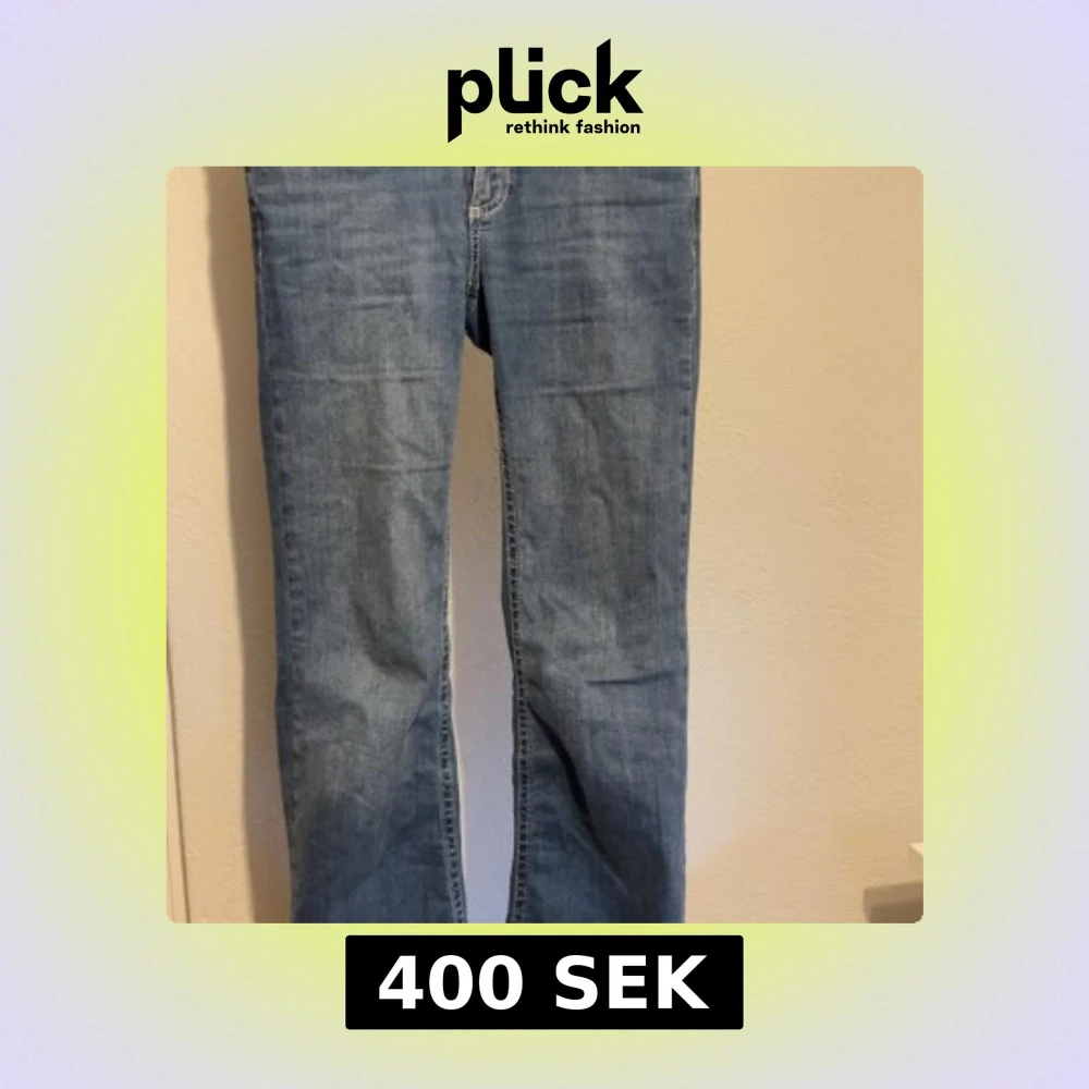 Säljer dom populära blå bootcut jeans från Nelly men snygga detaljer dom har normal passform och är även rätt så stretchiga💓 Dom e storlek 34 och uppsydda i längden r själv 162 och dom sitter bra i längden.
