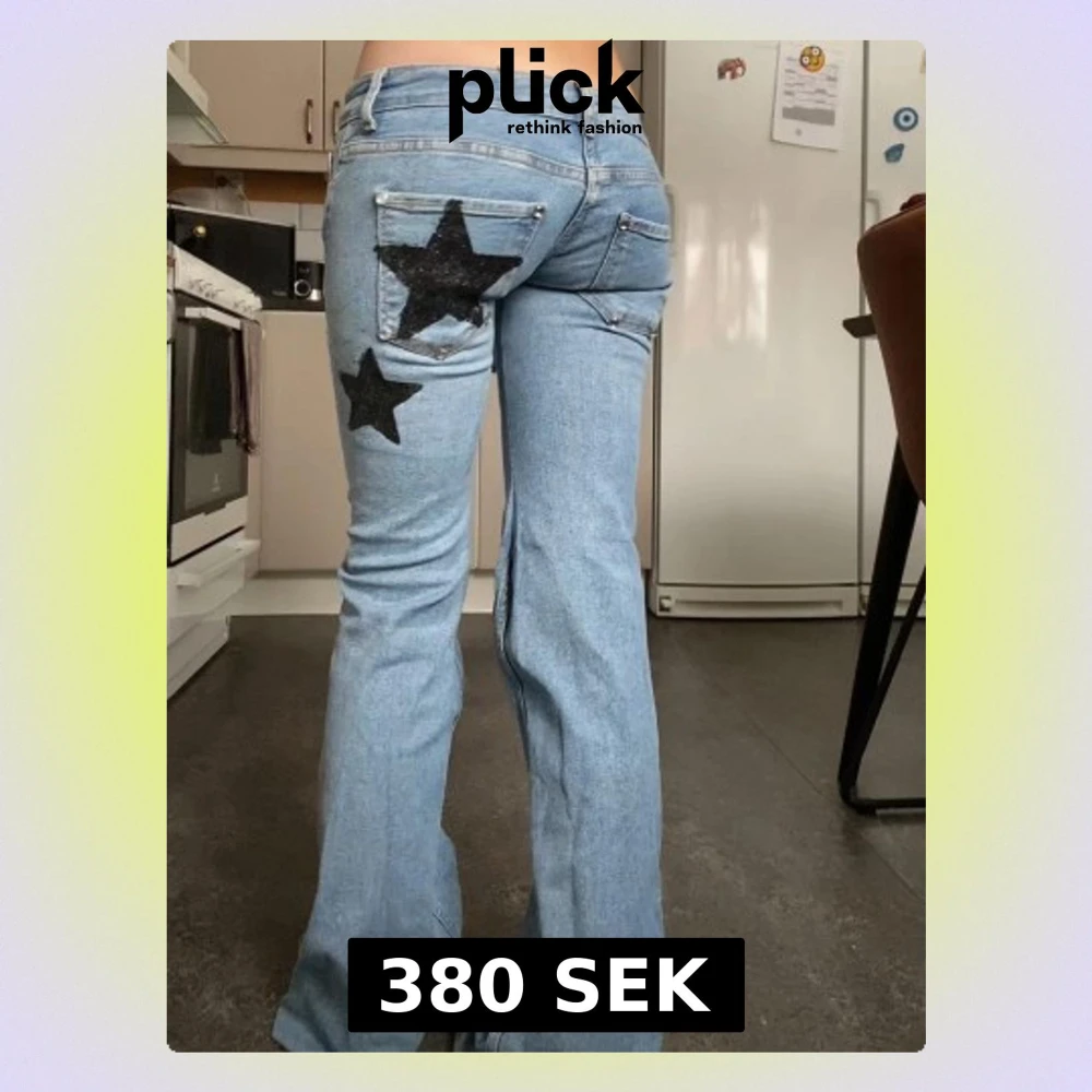 Unika ljusblå jeans med bootcut passform och två stora svarta stjärnor på bakfickan och benet. Från mitt uf: truestarjeans, Jeansen har tyvärr råa, slitna bensluten pga att de är inköpta begagnat. Storlek 36, måtten: ytterben:104cm innerben:87 lårlängd:17