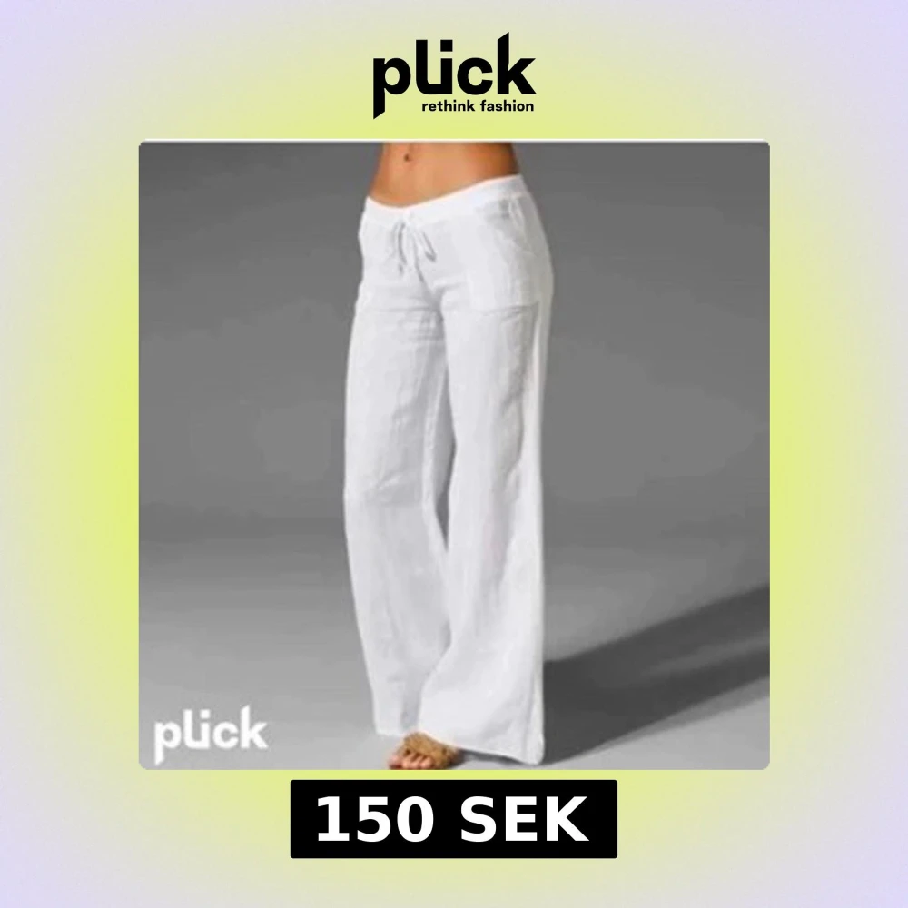 Snygga vita linnebyxor med breda ben och resor i midjan. Byxorna har hög midja och är tillverkade i svalt linnematerial, perfekta för varma dagar. De har en avslappnad passform och stora fickor framtill.