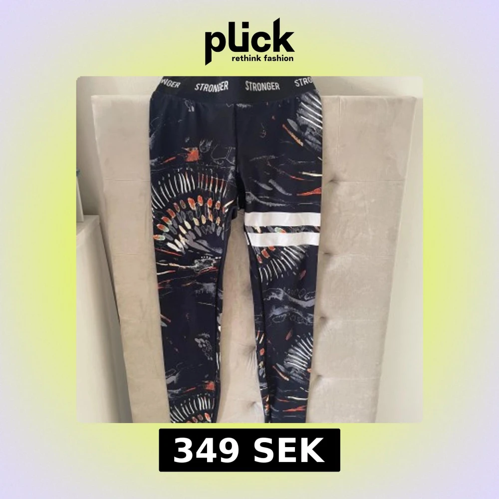 Snygga svarta leggings från Stronger med färgglatt abstrakt mönster i vitt, orange och grönt. De har bred resår i midjan med logga och två vita ränder på ena benet. Perfekta för träning eller chill. Materialet är stretchigt och följsamt. Tror det är storlek XS💞