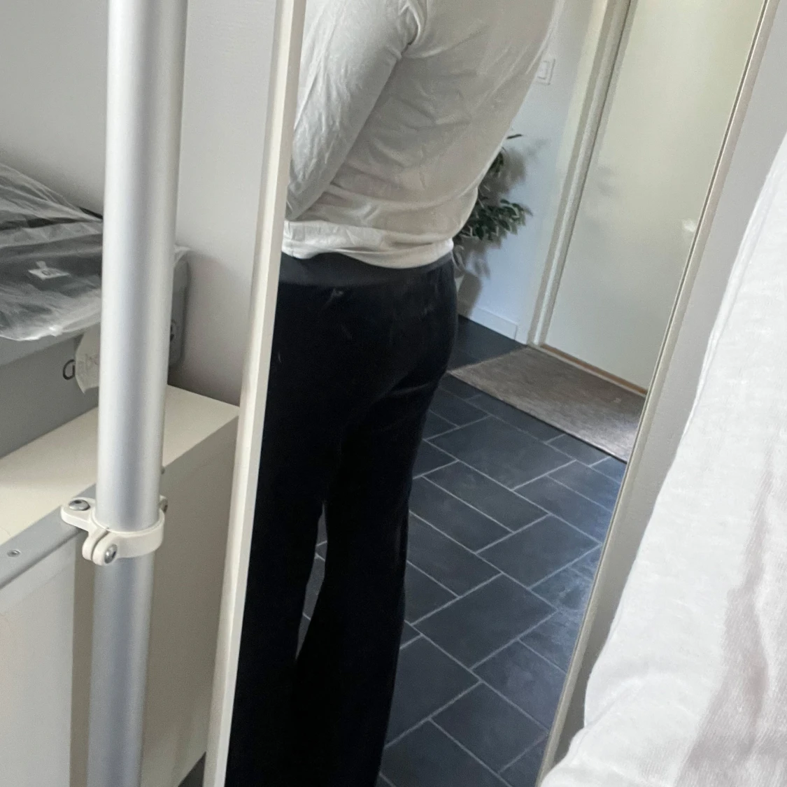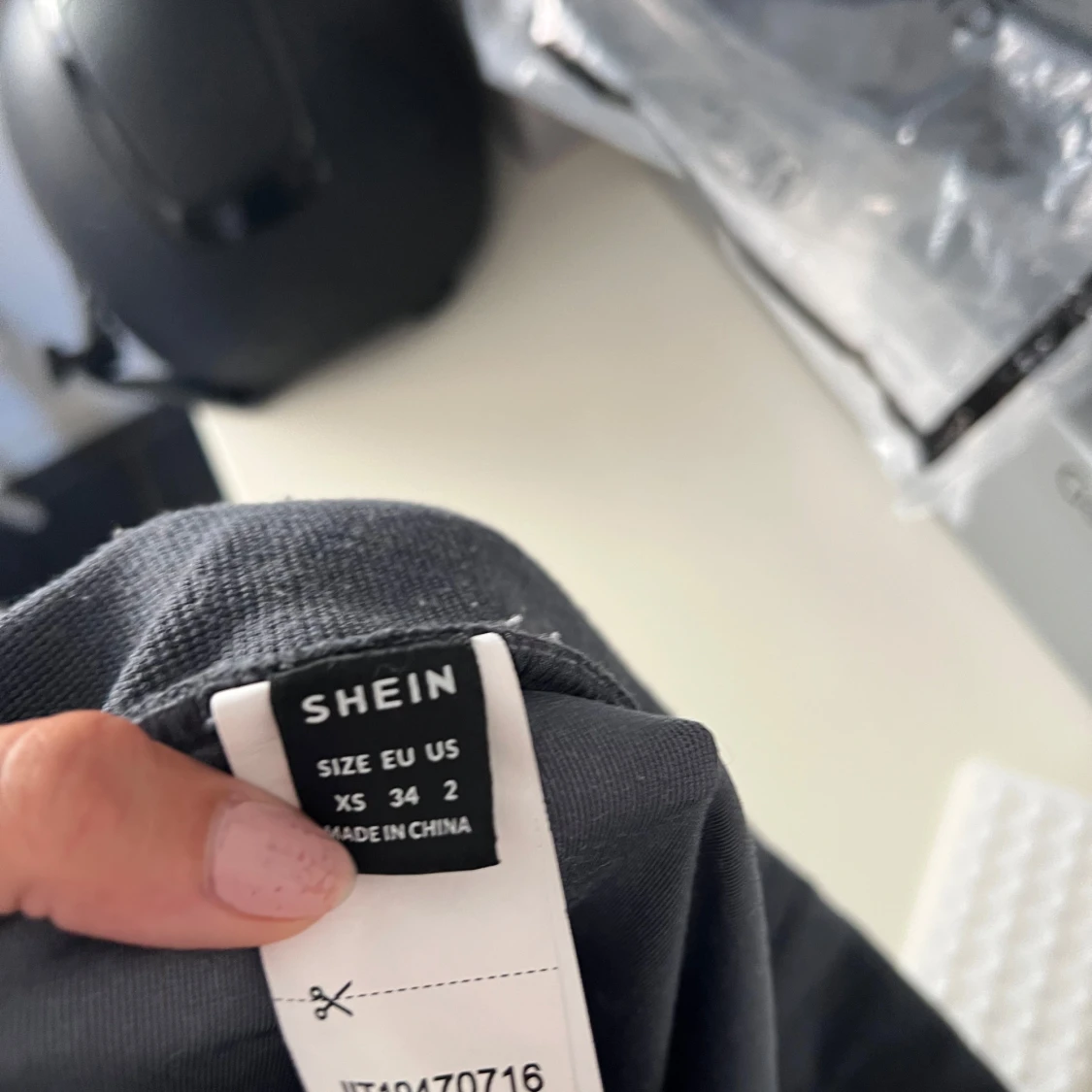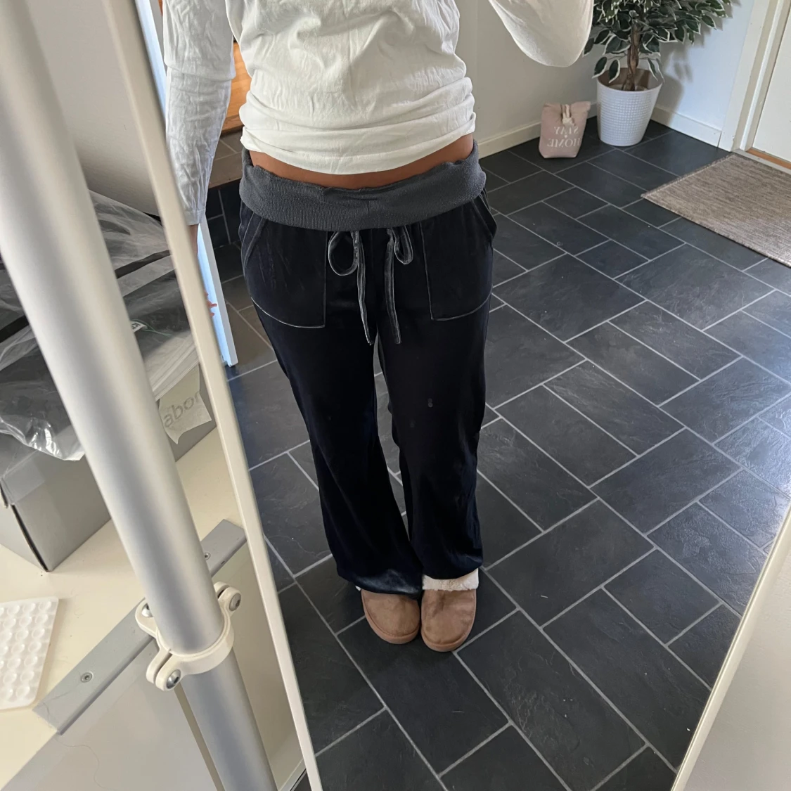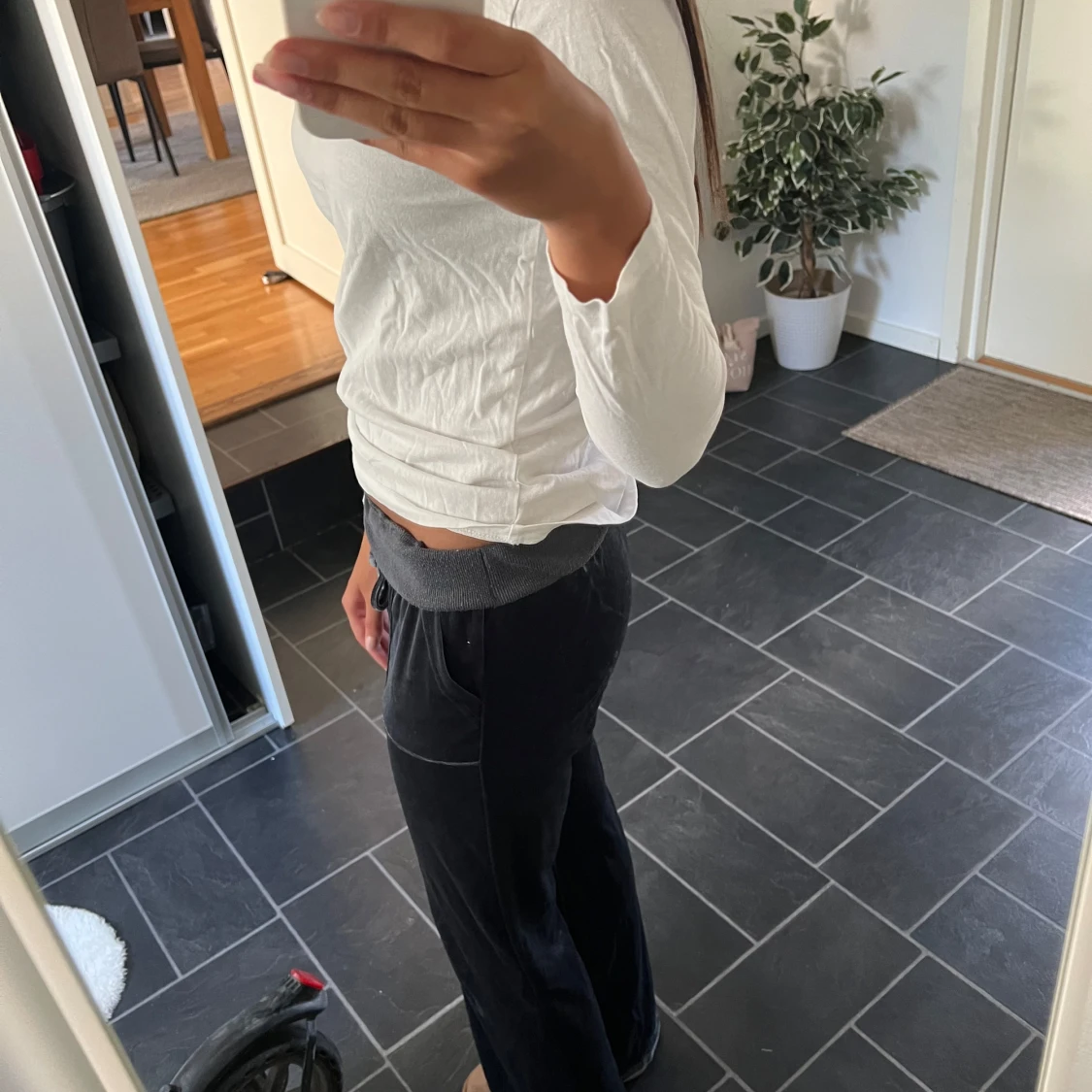Svarta mjukisbyxor från SHEIN i storlek XS med bred grå midjeresår och snörning. Byxorna har raka ben, stora fickor framtill och är gjorda i ett mjukt material som känns riktigt skönt. Perfekta för chill dagar eller när du vill vara bekväm.