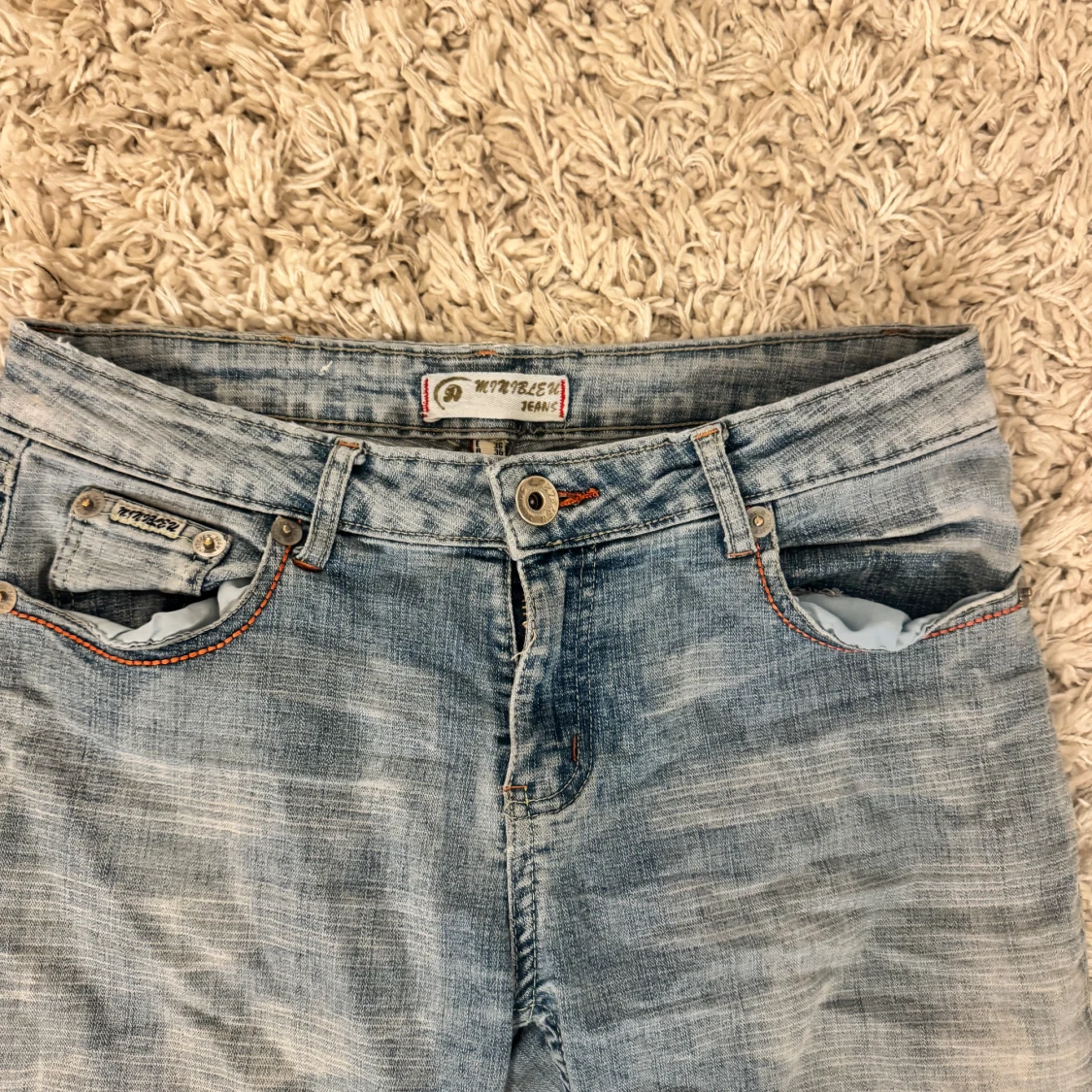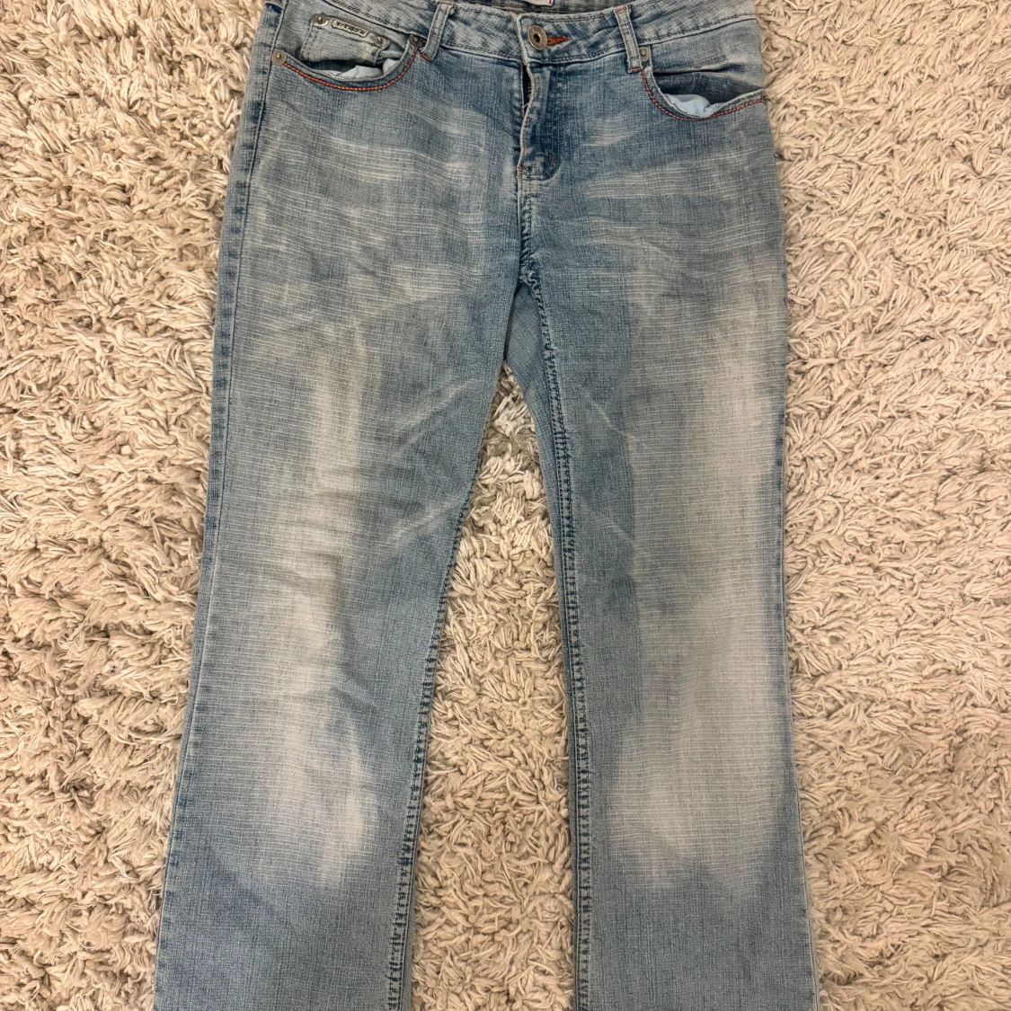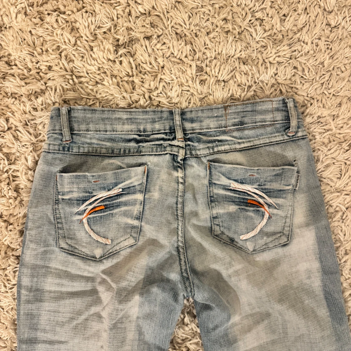 Säljer ett par ljusblå jeans från Marble Jeans med coola slitningar och broderade detaljer på bakfickorna i vitt och orange. De är bootcut och lågmidjade💞hör av er om ni har några frågor!!