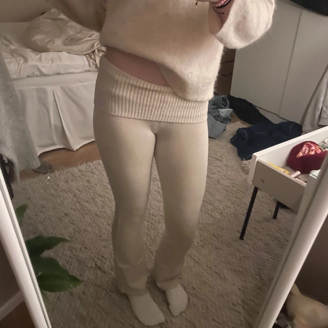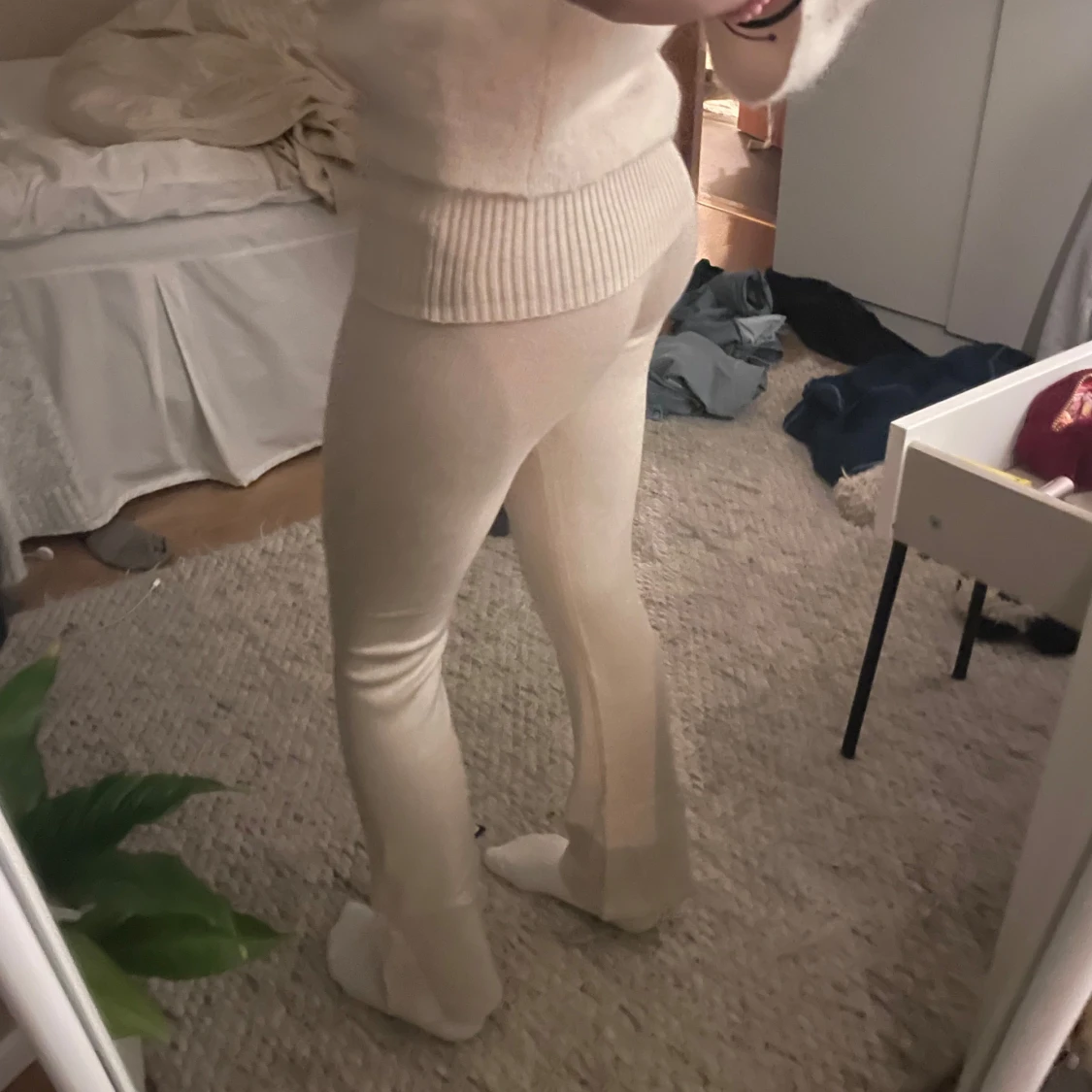 Mysiga beige stickade byxor med ribbad midja och bootcut passform. Från Gina Young och är i storlek 158/164. På mig är dom lite korta, är 165 cm lång. Dom är väldigt stretchiga. Är också helt nya med lapp.