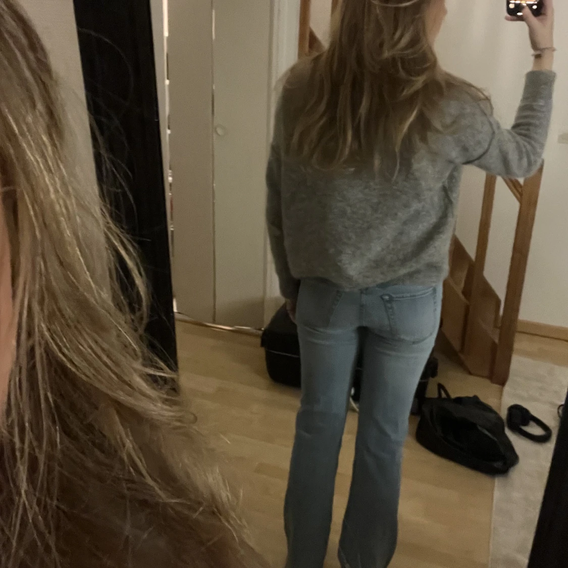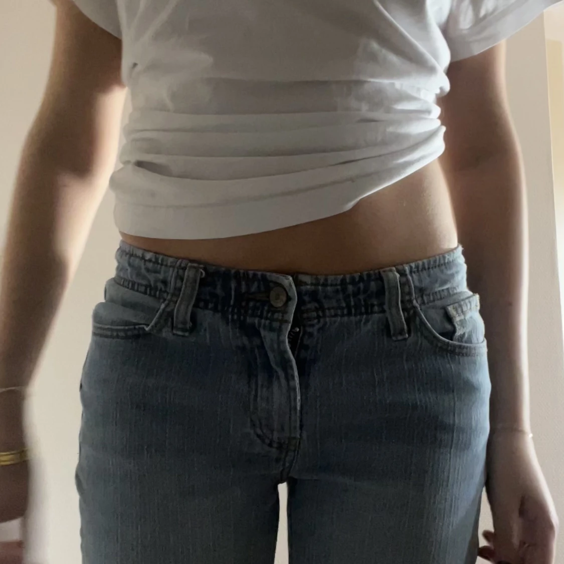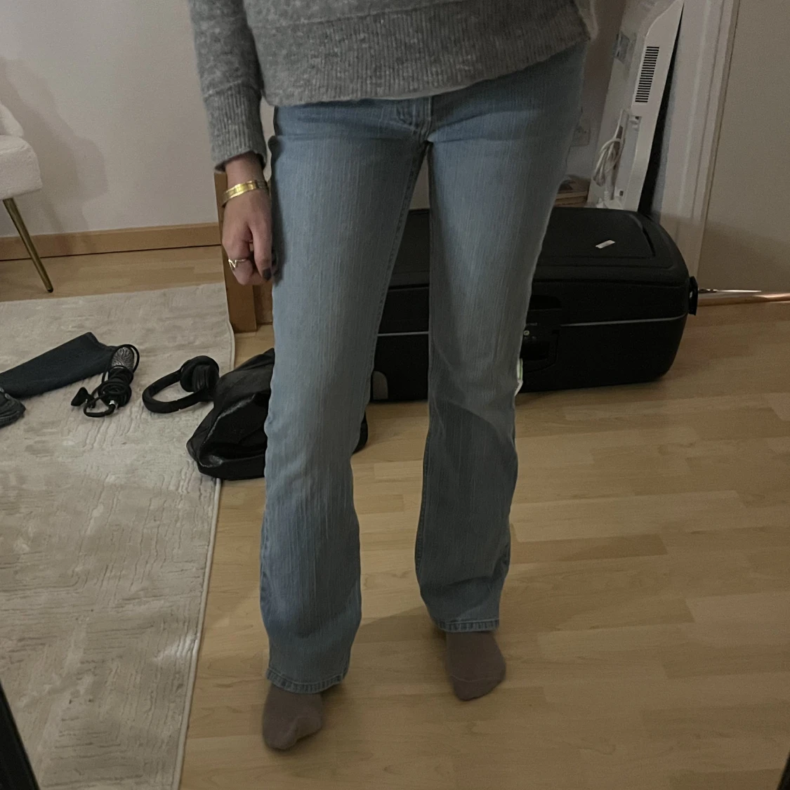 Super snygga lådmidjade, ljusblåa jeans med tunna vita ränder. I ny skick och bara använda 2 gånger. Passar mig som har storlek S eller 26x32