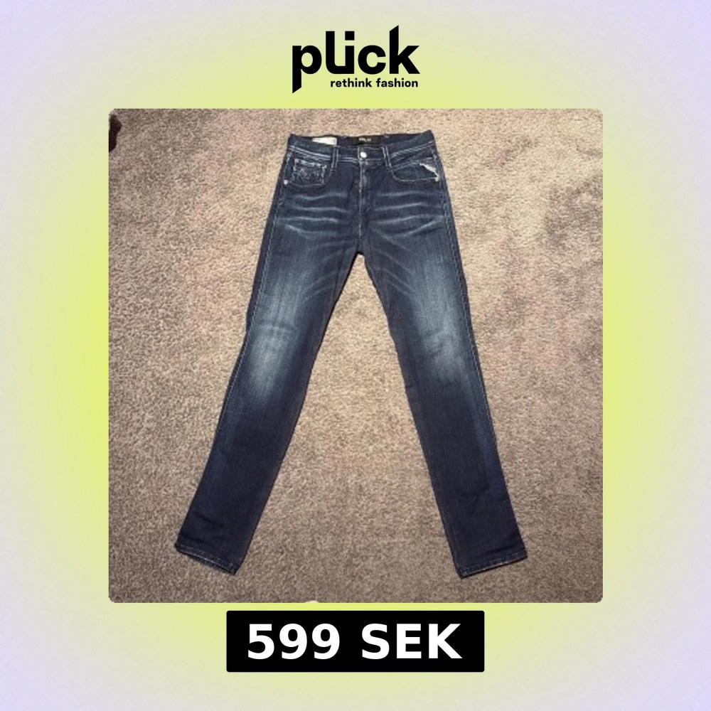 Snygga blå jeans från Replay i modellen Anbass. De har en slim passform och är tillverkade i deras bekväma Hyperflex-material. Klassisk femficksdesign med dragkedja och knapp. Perfekta för en stilren look. Storlek 30/32. Grymt snygg tvätt! Inga tecken på användning.