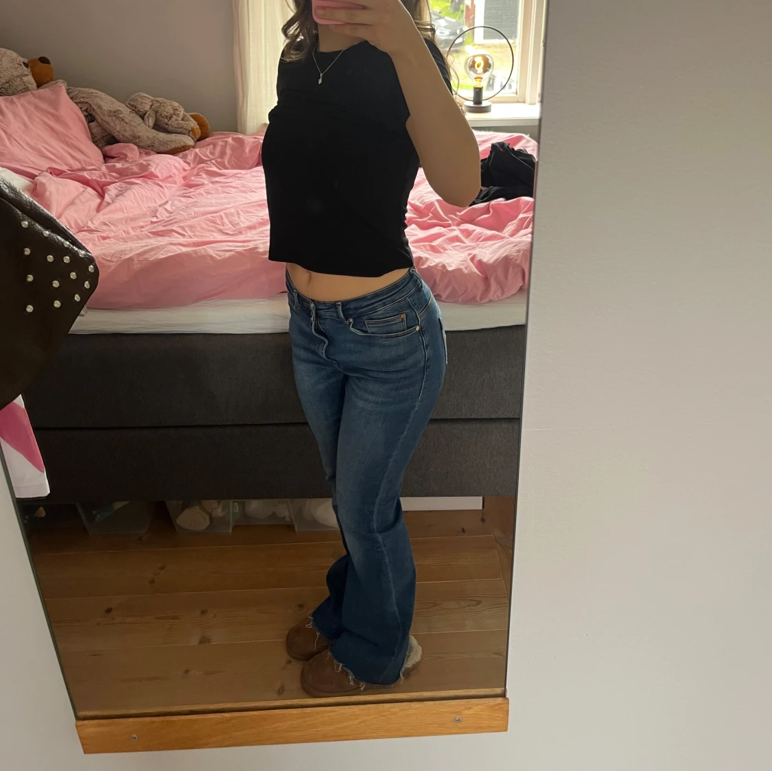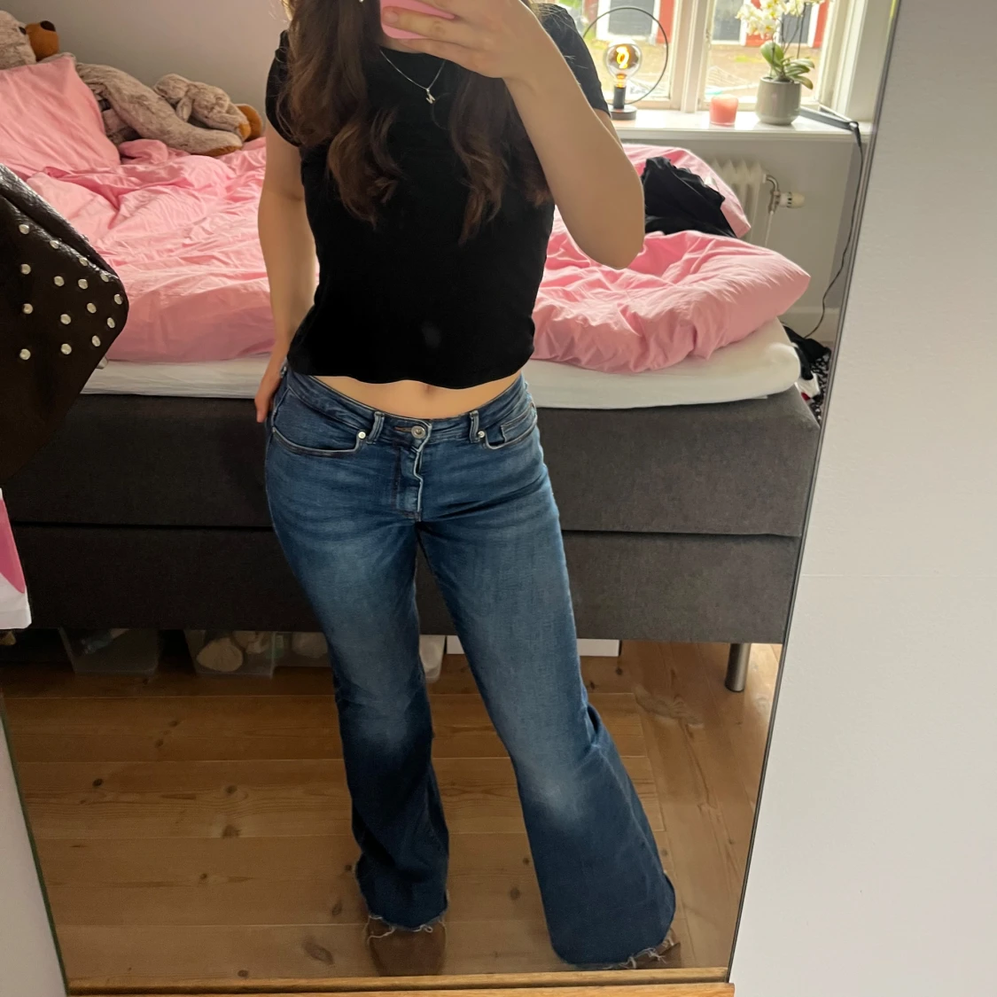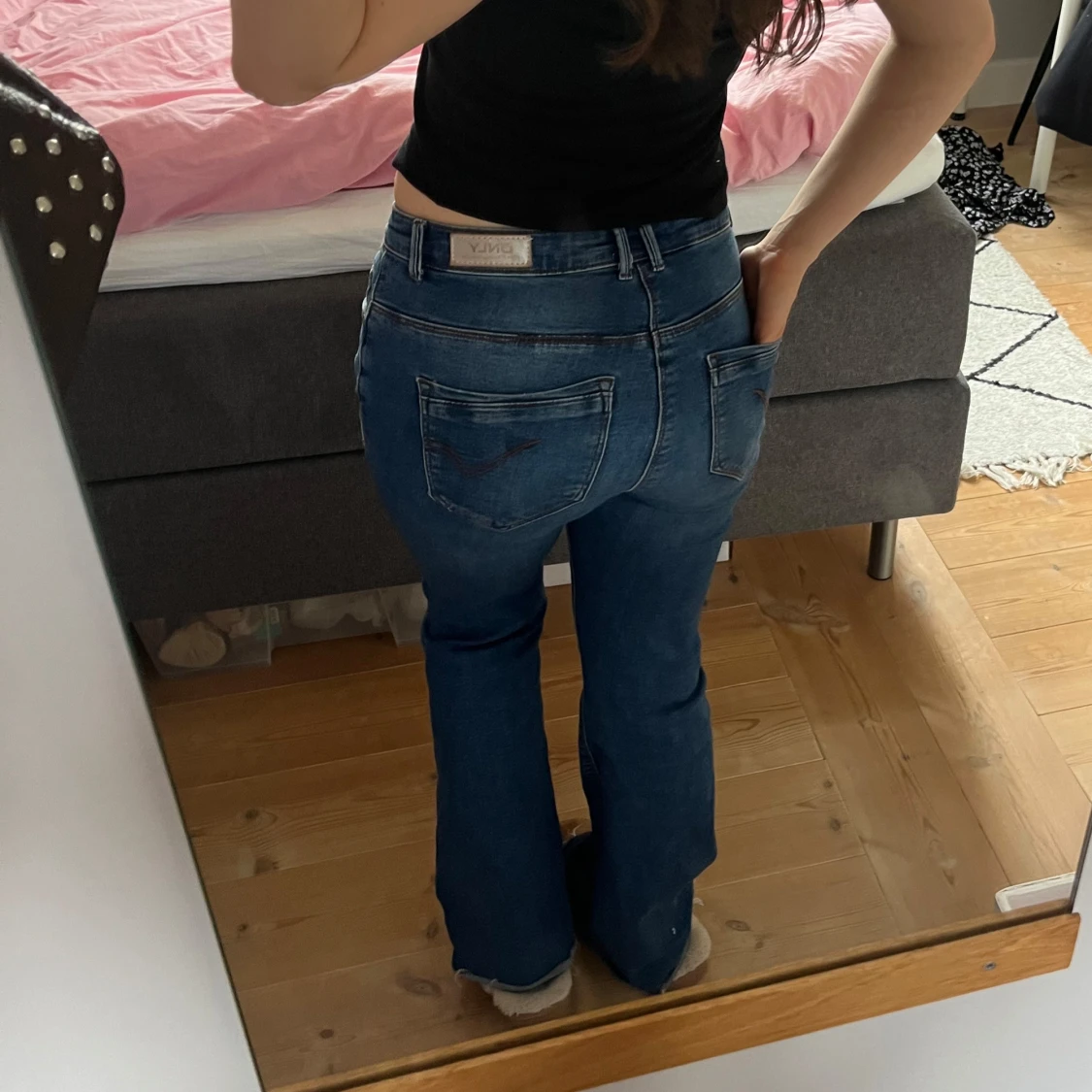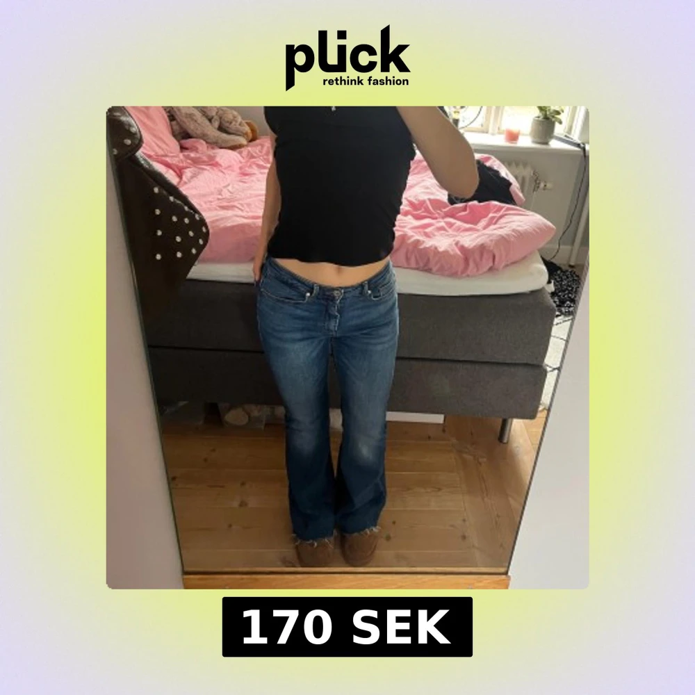 Säljer ett par blå bootcut jeans med låg midja. Jeansen har klassisk femficksdesign och lätt utsvängda ben. Perfekta för dig som gillar en retroinspirerad look. Passar till många olika stilar. Storlek S och längd 30