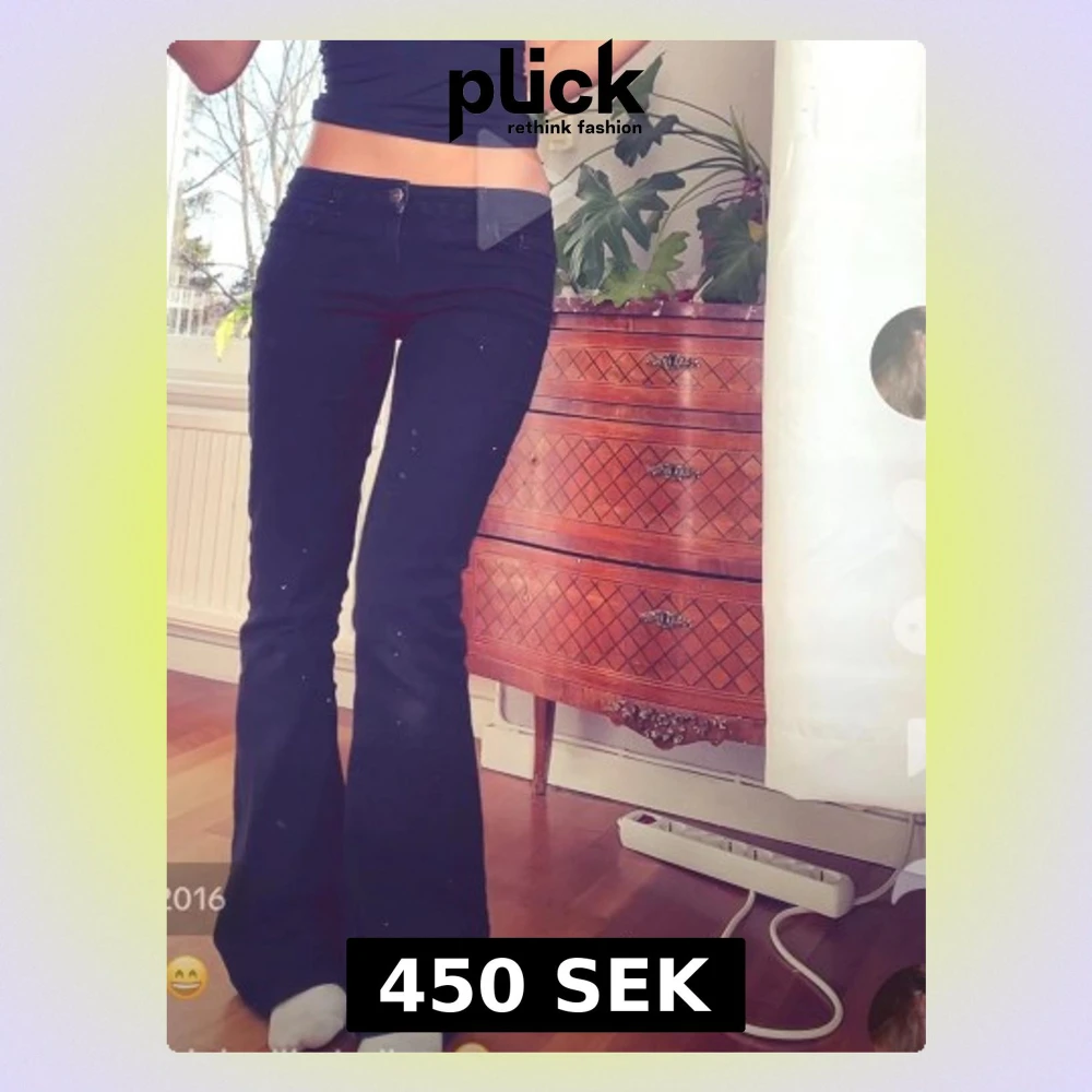 Säljer ett par svarta bootcut jeans med låg midja. Jeansen har klassisk femficksdesign och är tillverkade i ett stretchigt denimtyg som sitter snyggt över höfterna och släpper ut vid benen. Är 167 mina bilder