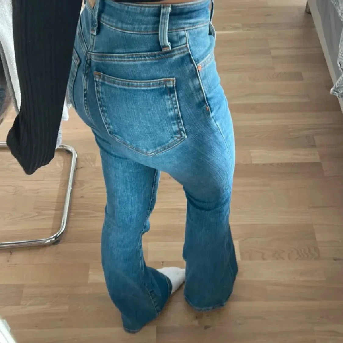 (KOLLA IN RESTEN AV MIN PROFIL!!) Snygga blå bootcut jeans, perfekta för en avslappnad stil. Har använts ett par gånger men jag tyckte inte det var riktigt min stil. (GRATIS FRAKT KAN FIXAS PÅ ALLA KÖP VID SNABBKÖP KONTAKTA BARA MIG INNAN!)